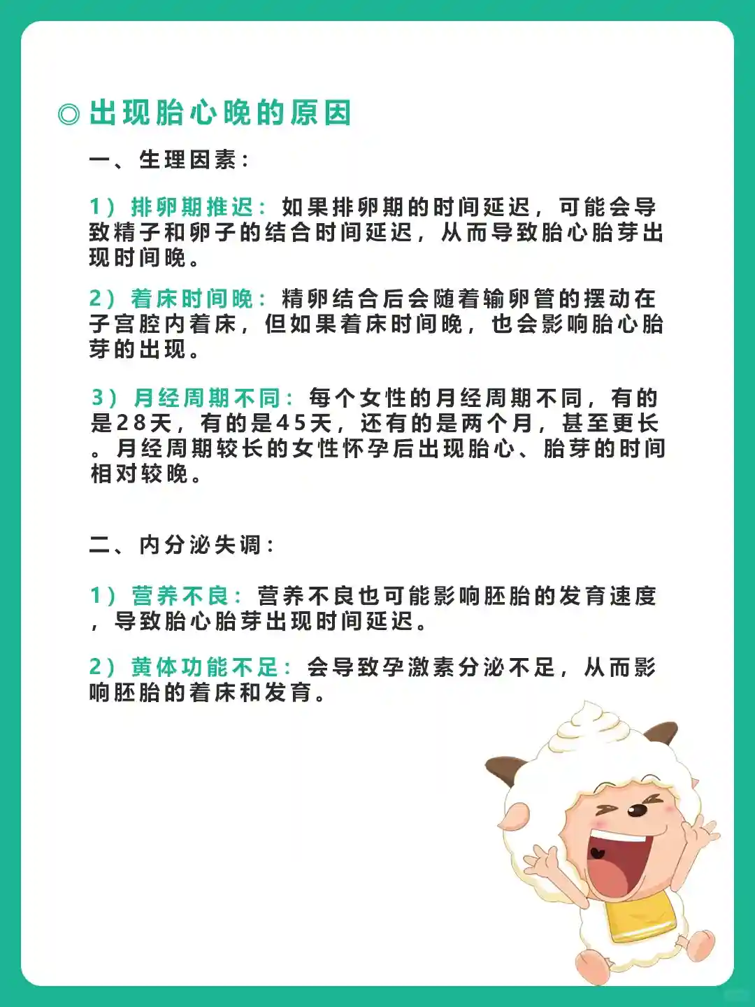 2️⃣着床时间晚:j卵结合后会随着输卵管的摆动在子宫腔内着床,但如果着床时间晚,也会影响胎心胎芽的出现;3️⃣月经周期不同:每个女性的月经周期不同,有的是28天,有的是45天,还有的是两个月,甚至更长。月经周期较长的女性怀孕后出现胎心、胎芽的时间相对较晚。