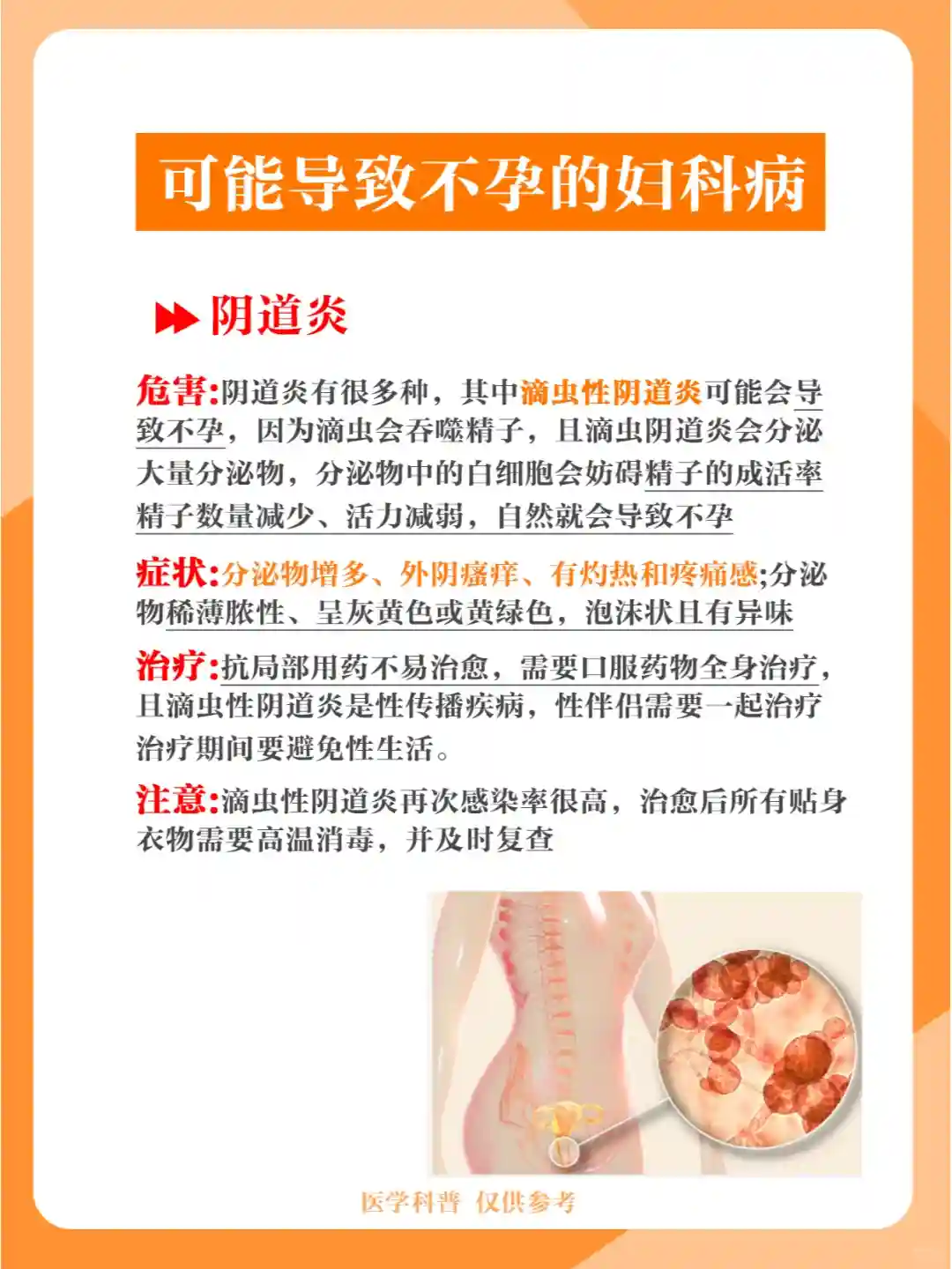 危害:阴道炎有很多种,其中滴虫性阴道炎可能会导致不孕,因为滴虫会吞噬精子,且滴虫阴道炎会分泌大量分泌物,分泌物中的白细胞会妨碍精子的成活率精子数量减少、活力减弱,自然就会导致不孕