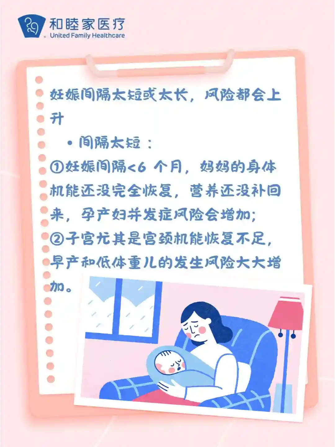 1️⃣ 妊娠间隔小于 6 个月,妈妈的身体机能还没完全恢复,营养还没补回来,孕产妇并发症风险会增加;2️⃣ 子宫尤其是宫颈机能恢复不足,早产和低体重儿的发生风险也会大大增加。