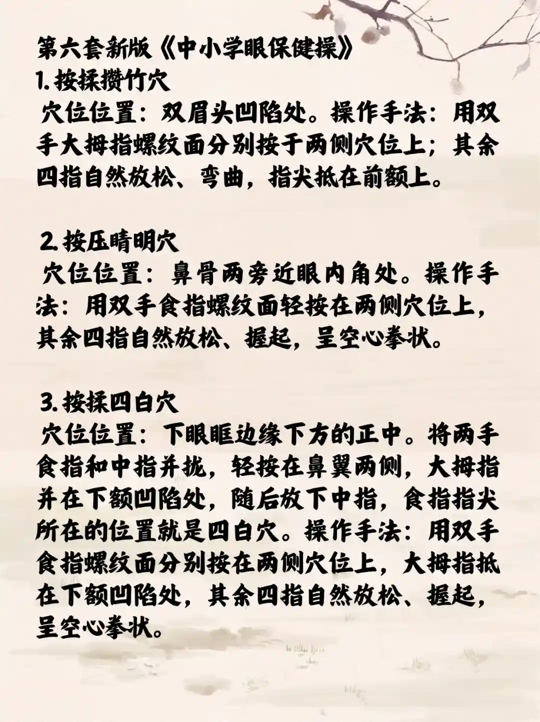 穴位位置:鼻骨两旁近眼内角处。操作手法:用双手食指螺纹面轻按在两侧穴位上,其余四指自然放松、握起,呈空心拳状。