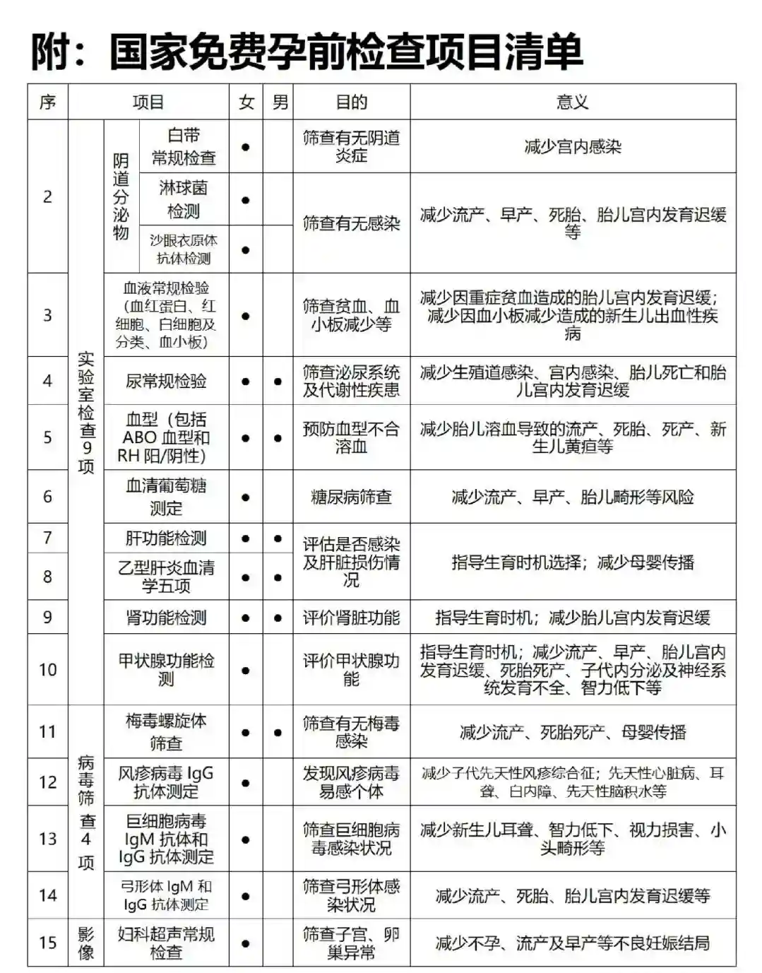 男生项目比较少,比较基础,基本上是采血取尿,检测身体基本功能是否健康,以及有无传染病,外科会看看生殖器官是否健全,基本上跟每年的常规体检和入职体检没有差别,所以除了免费项目外,必要的自费孕前检查应该做一做。
