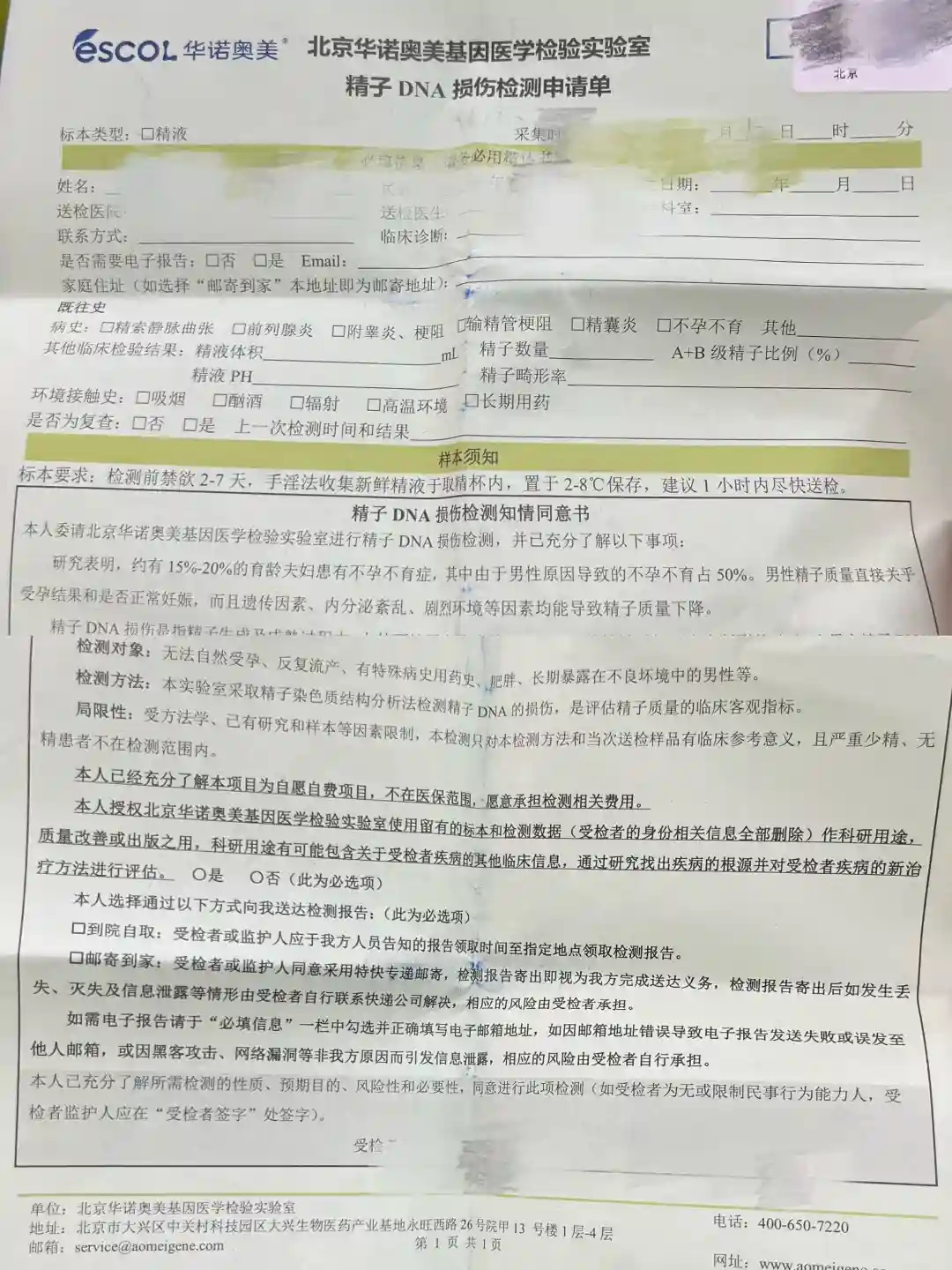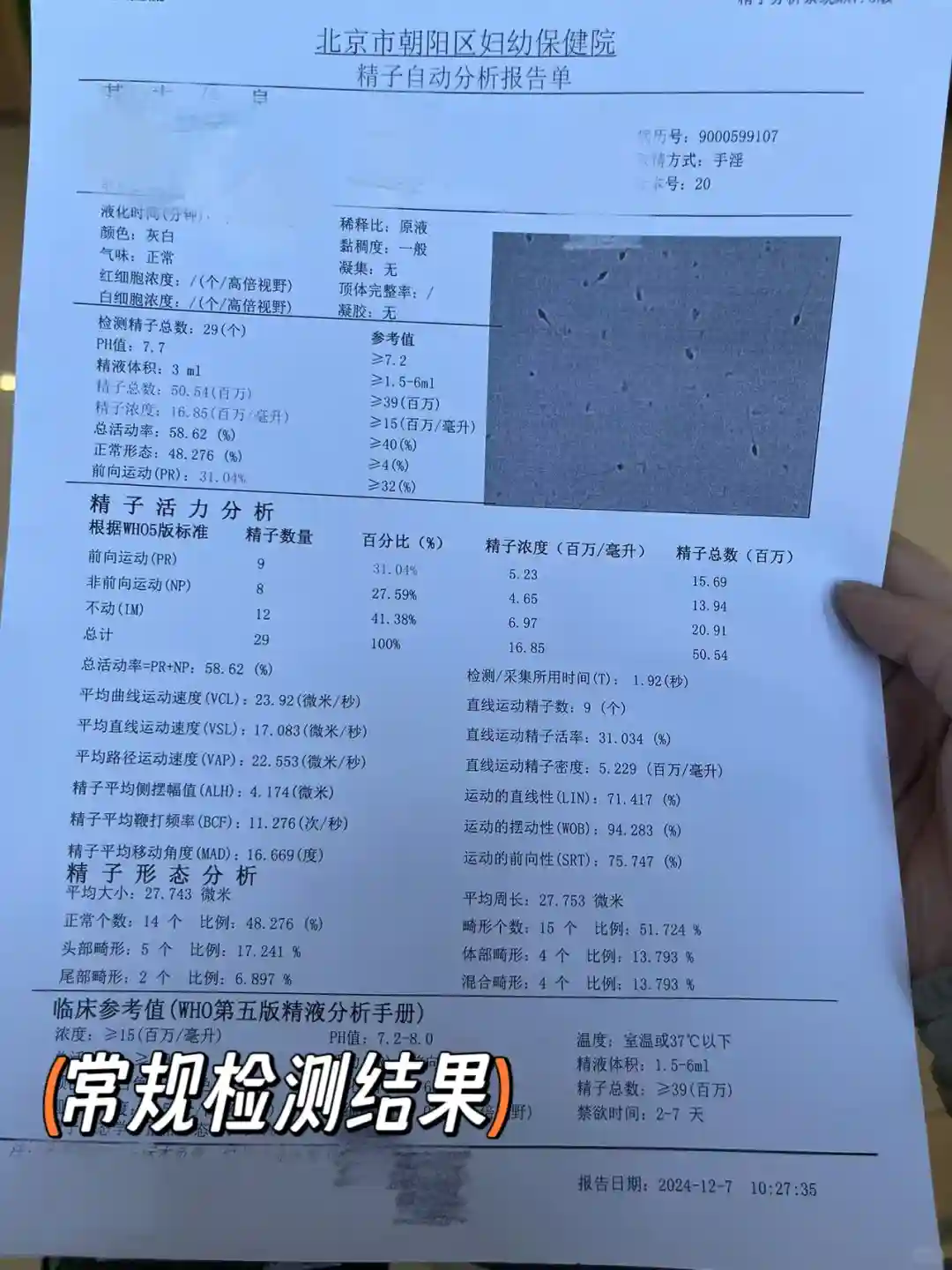 因为离家近,我老公的免费孕前检查和自费加项都是在朝阳妇幼做的,基本上所有的妇幼都可以做免费检查和小蝌蚪常规检查,但是小蝌蚪DNA检测并不是所有医院都可以做,可以咨询挑选一下。免费检查需小程序上提前预约挂号,自费加项不用预约,直接到三层体检中心前台找医生即可。二层有取蝌蚪的专门房间,每个单间都有锁,数量有限,人满了就只能去卫生间了,建议工作日去。常规检查和DNA检查需要分两次进行,每次检查前需要禁欲2-7天,不要超过这个时间范围,间隔太短或太长都会影响检查结果。常规检查可医保报销,DNA检查要送院外实验室,不报销但可用医保余额。