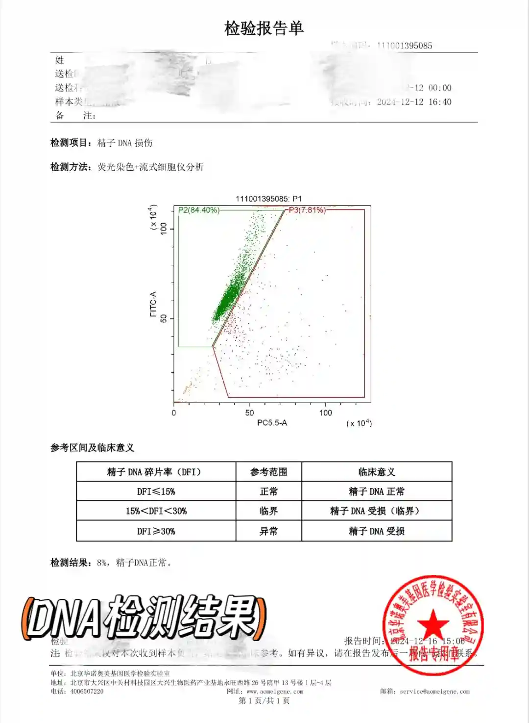 检查DNA碎片率(DFI)指数,是评估小蝌蚪所携带的遗传物质的完整性及功能性的指标,DNA发生碎片化会对生育产生负面影响,造成不育和反复流产,DFI小于等于15%则DNA完整性较好,生育能力佳。