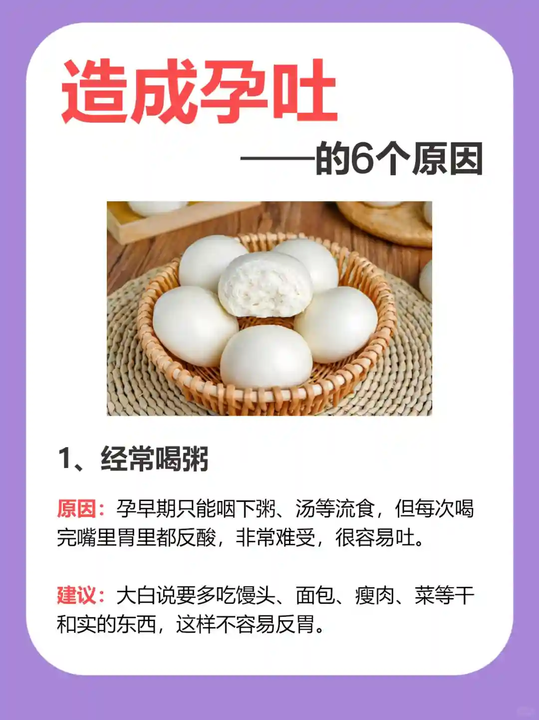 建议:大白说要多吃馒头、面包、瘦肉、菜等干和实的东西,这样不容易反胃。