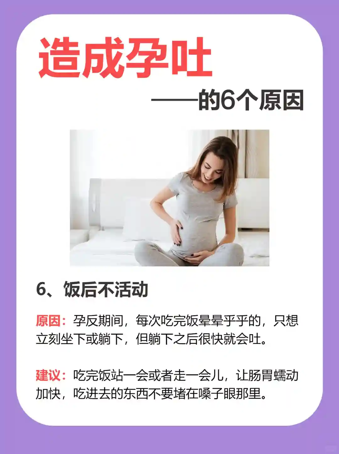 原因:孕反期间,每次吃完饭晕晕乎乎的,只想立刻坐下或躺下,但躺下之后很快就会吐。