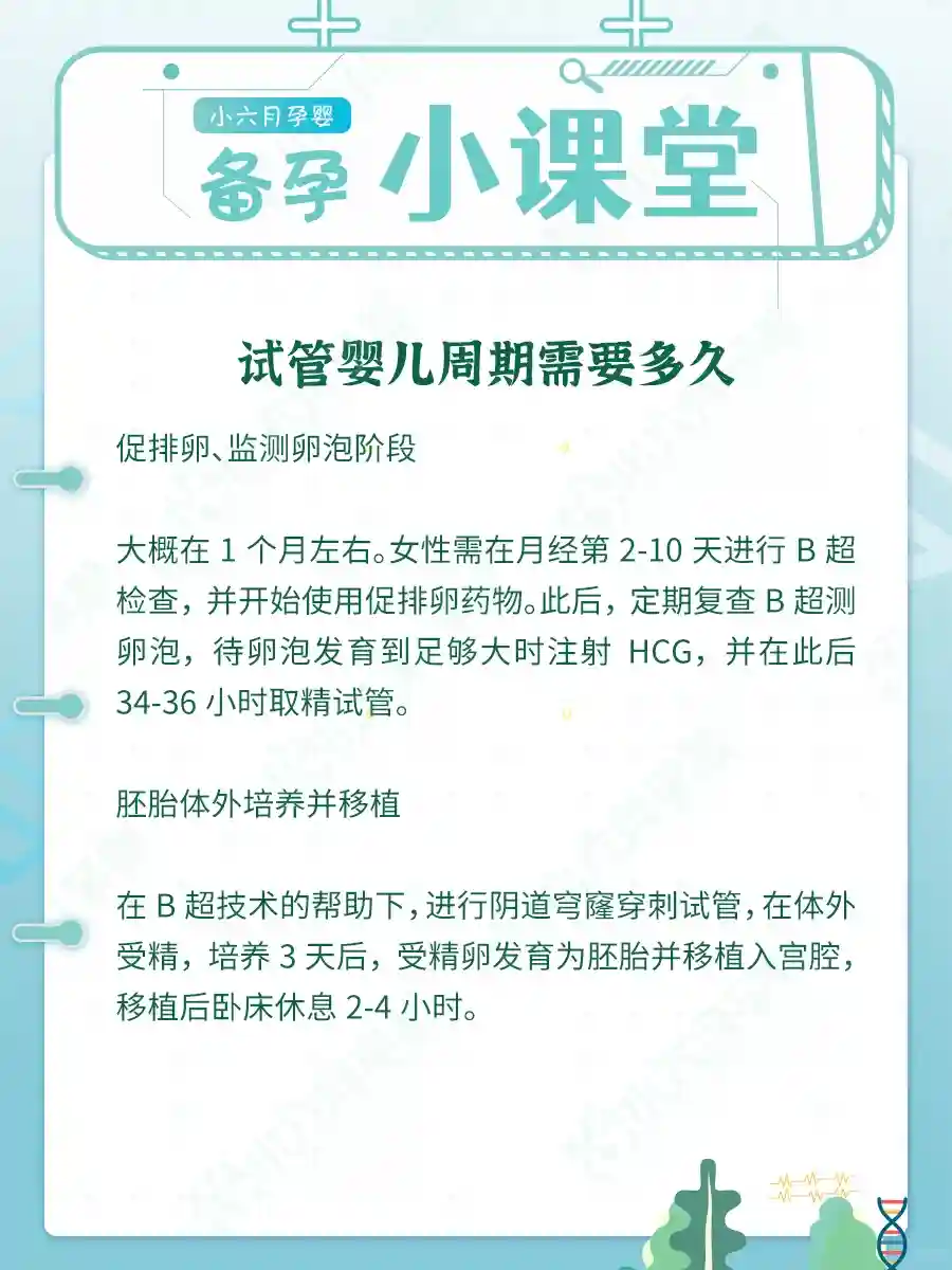 大概在1个月左右。女性需在月经第2-10天进行B超检查,并开始使用促排卵药物。此后,定期复查B超测卵泡,待卵泡发育到足够大时注射HCG,并在此后34-36小时取精试管。