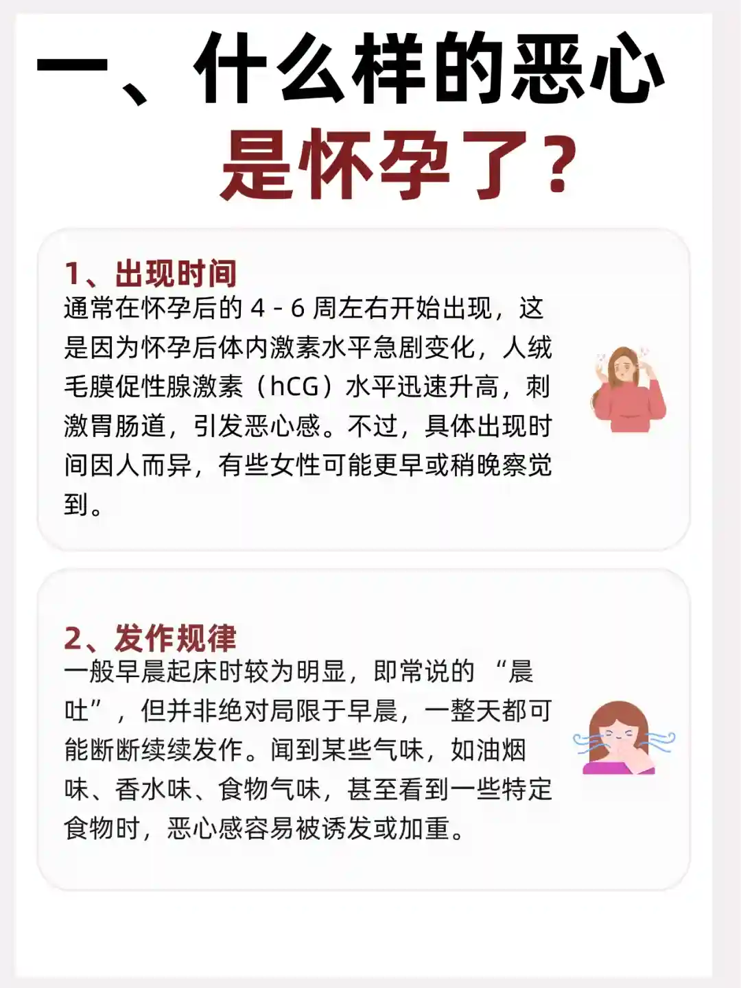 1、出现时间:通常在怀孕后的 4 - 6 周左右开始出现,这是因为怀孕后体内激素水平急剧变化,hCG水平迅速升高,刺激胃肠道,引发恶心感。不过,具体出现时间因人而异,有些女性可能更早或稍晚察觉到。