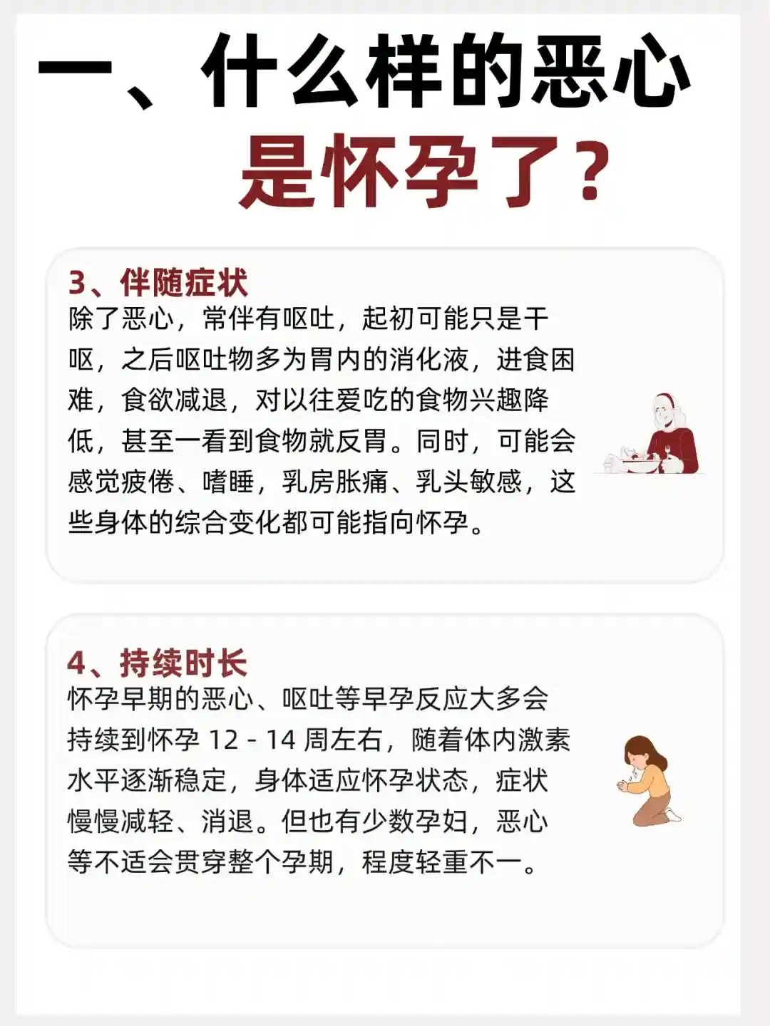 7、恶心、呕吐:通常被称为“晨吐”,但可能在一天中的任何时间发生。