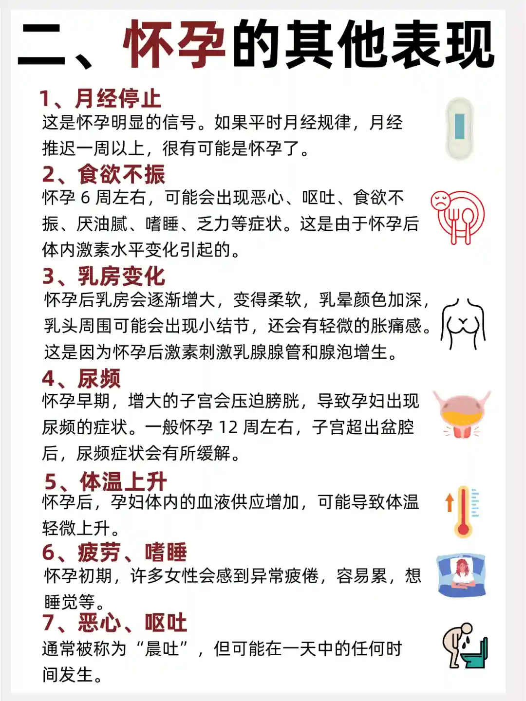 4、尿频:怀孕早期,增大的子宫会压迫膀胱,导致孕妇出现尿频的症状。一般怀孕 12 周左右,子宫超出盆腔后,尿频症状会有所缓解。