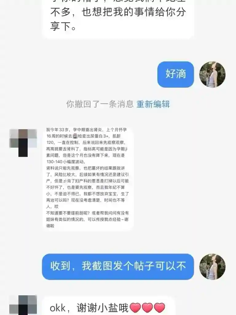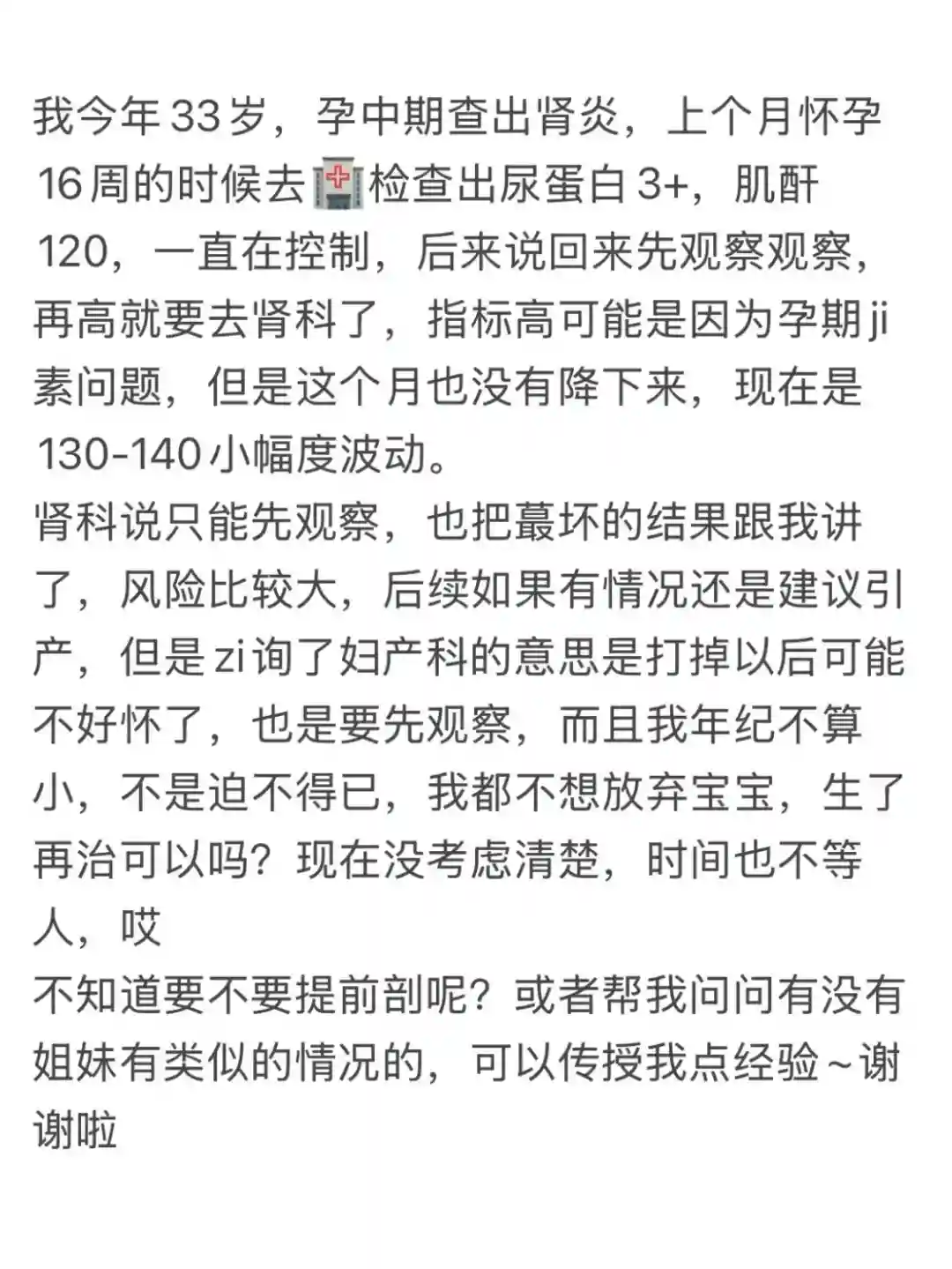 我今年33岁,孕中期查出肾炎,上个月怀孕16周的时候去🏥检查出尿蛋白3+,肌酐120,一直在控制,后来说回来先观察观察,再高就要去肾科了,指标高可能是因为孕期ji素问题,但是这个月也没有降下来,现在是130-140小幅度波动。