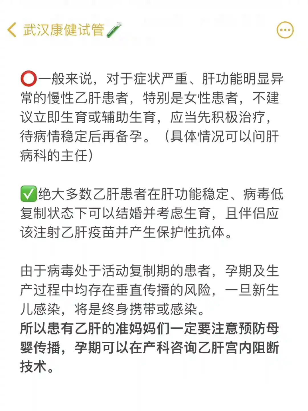 ⭕️一般来说,对于症状严重、肝功能明显异常的慢性乙肝患者,特别是女性患者,不建议立即生育或辅助生育,应当先积极治疗,待病情稳定后再备孕。(具体情况可以问肝病科的主任)
