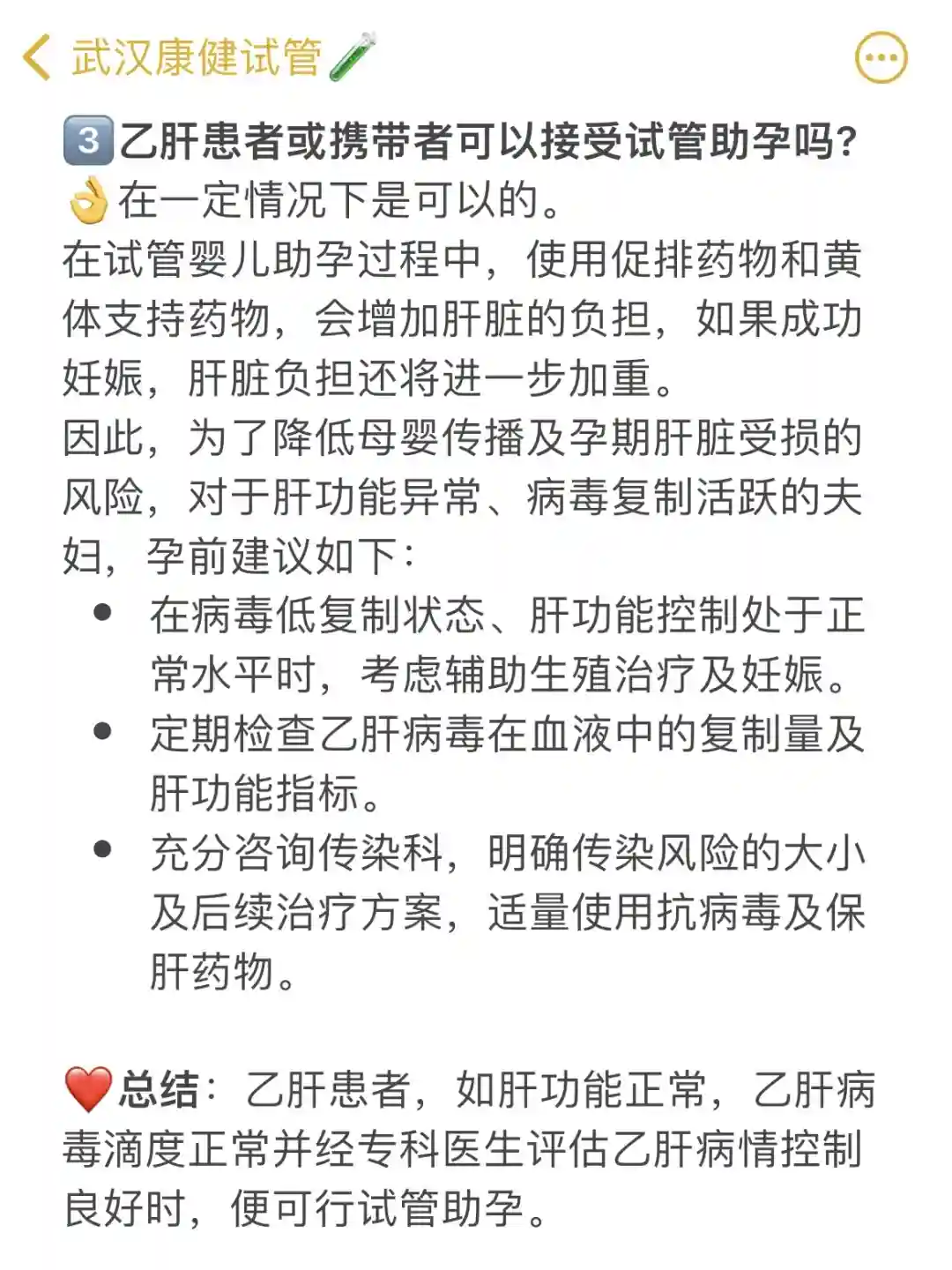 ❤️总结:乙肝患者,如肝功能正常,乙肝病毒滴度正常并经专科医生评估乙肝病情控制良好时,便可行试管助孕。