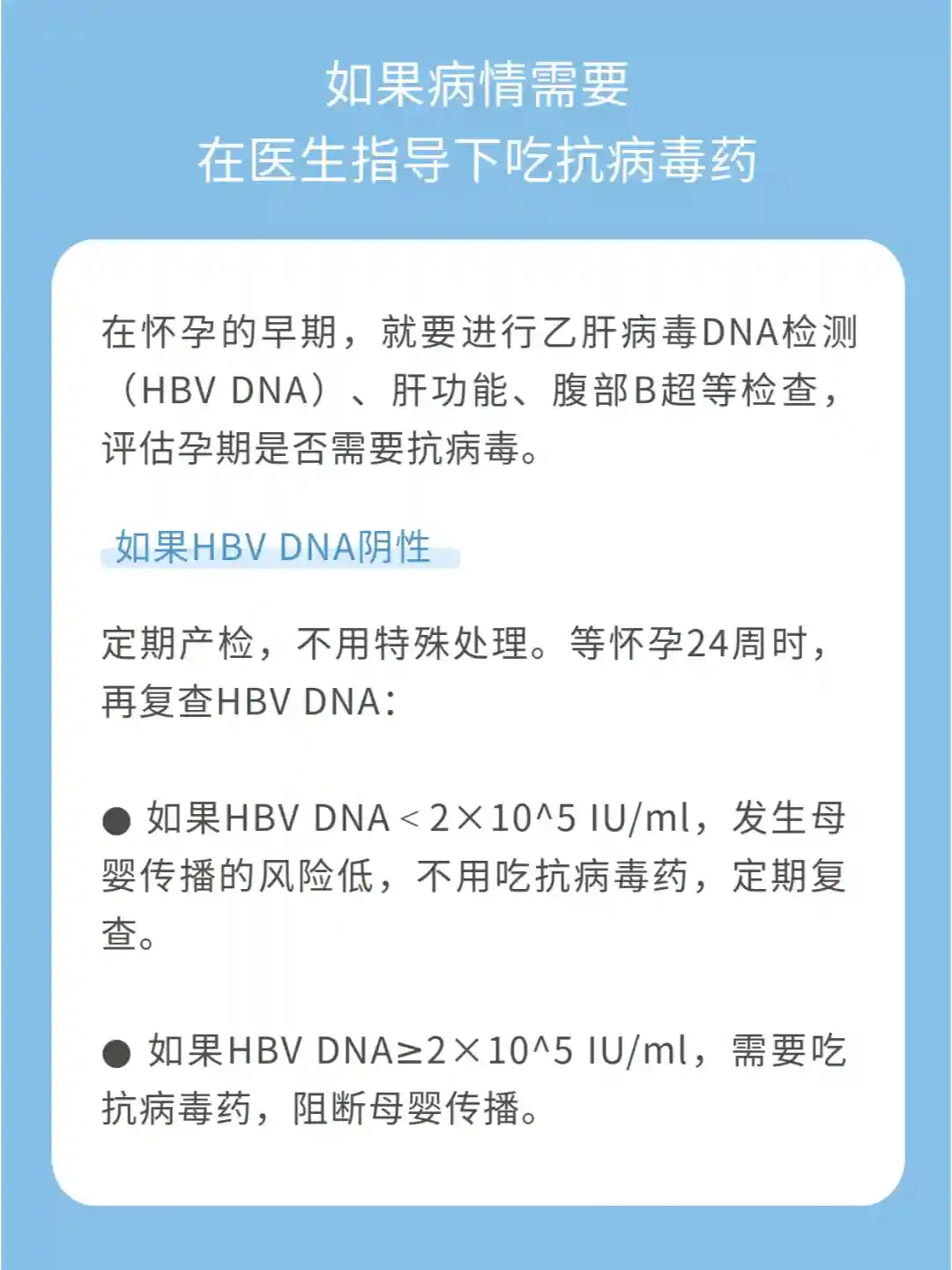 怀孕早期,就要进行乙肝病毒DNA检测(HBV DNA)、肝功能、腹部B超等检查,评估孕期是否需要抗病毒。