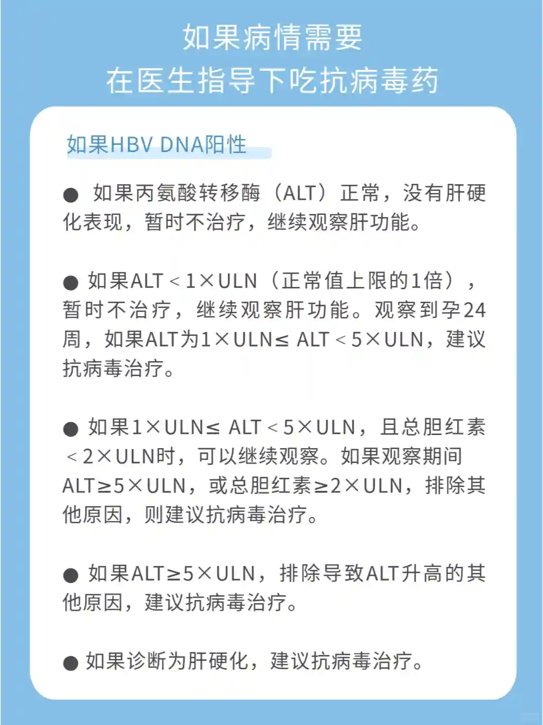 ● 如果ALT<1×ULN(正常值上限的1倍),暂时不治疗,继续观察肝功能。观察到孕24周,如果ALT为1×ULN≤ ALT<5×ULN,建议抗病毒治疗。