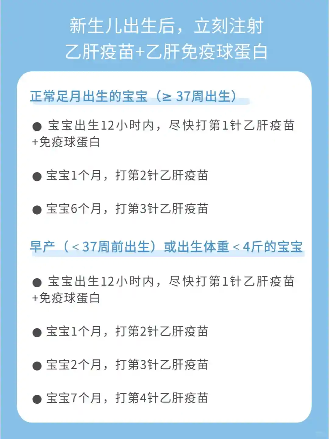 ● 宝宝出生12小时内,尽快打第1针乙肝疫苗+免疫球蛋白