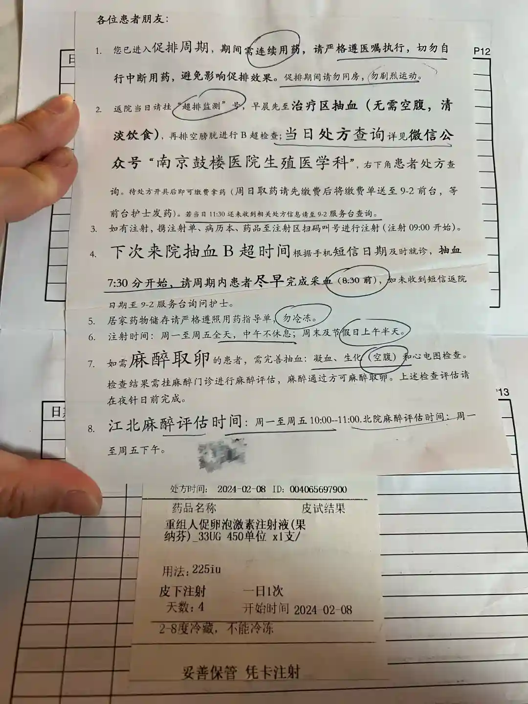 提示:各项检查都是提前把后一天的开好了,早上7.30之前到医院准时先抽血然后等8点做B超,然后就等微信南京鼓楼生殖医学粉色小程序等医生开好电子处方,根据要求做当天和下一次到院安排。