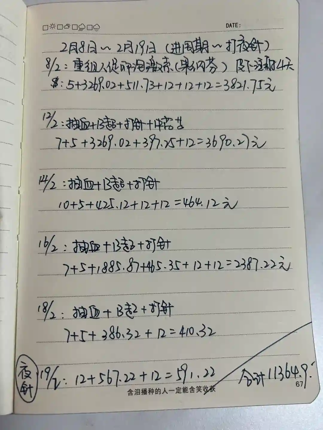 2.8-2.19费用总计11364.9元,路费油费住宿费不算