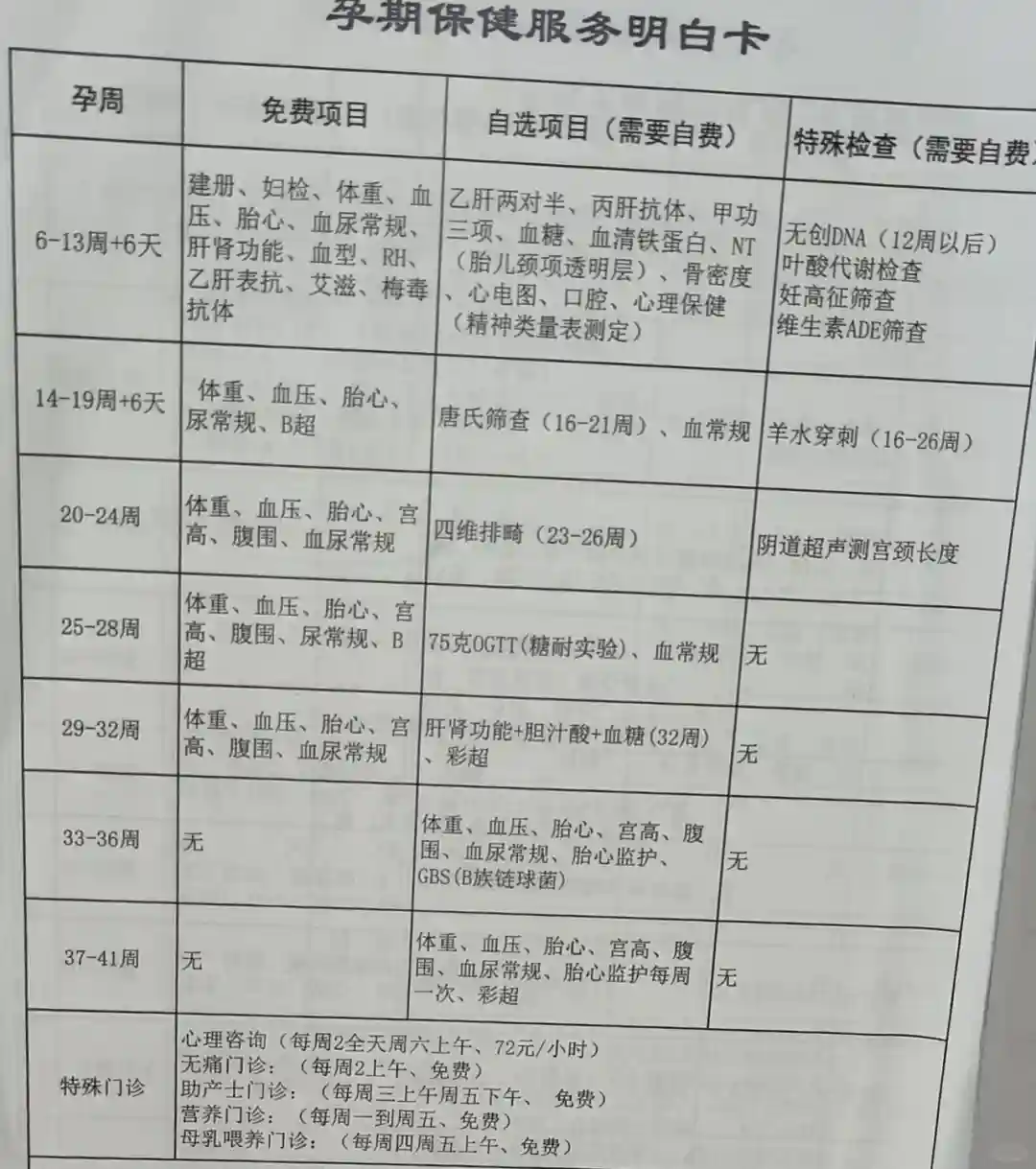 免费检查:初期的传染病筛查,如上图,乙肝,梅毒,艾滋,血常规,尿常规,b超等。后期就定期复查血常规,尿常规,还有几个免费b超,本地唐筛也是免费。产后42天还有一项产后免费的恢复情况检查。