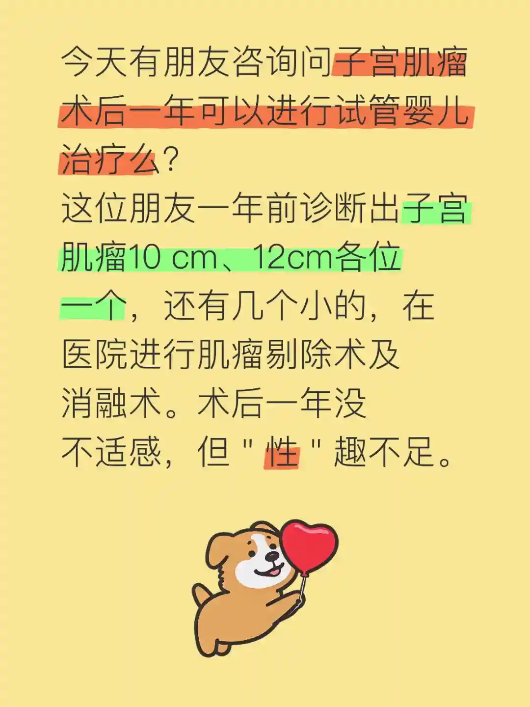 这位朋友一年前诊断出子宫肌瘤10 cm、12cm各位一个,还有几个小的,在医院进行肌瘤剔除术及消融术。术后一年没不适感,但"性"趣不足。