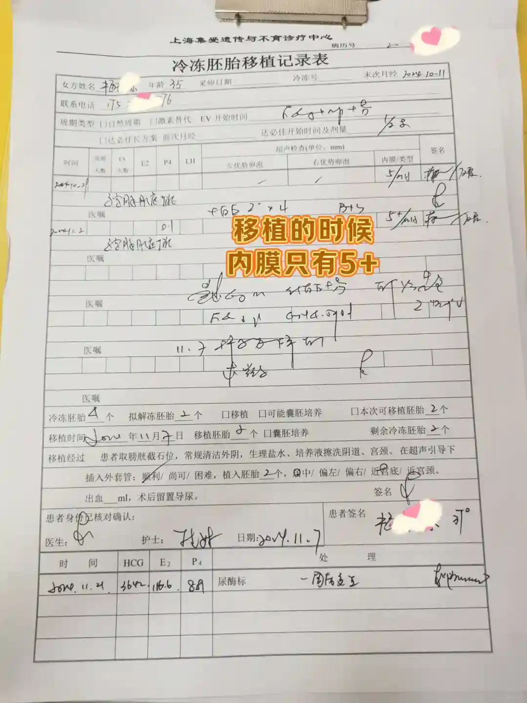 3⃣患者在宫腔镜做完、移植周期内膜只有5mm的时候,没有犹豫纠结,没有退缩,我们都坚定地选择了移下去。从今年五月开始到11月成功,没有浪费一个月的时间。(图4)