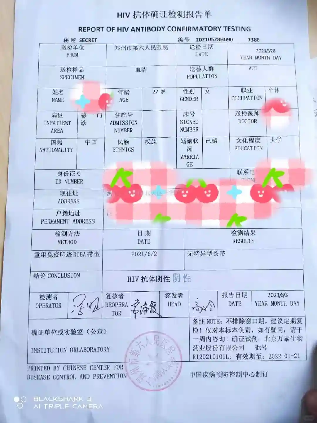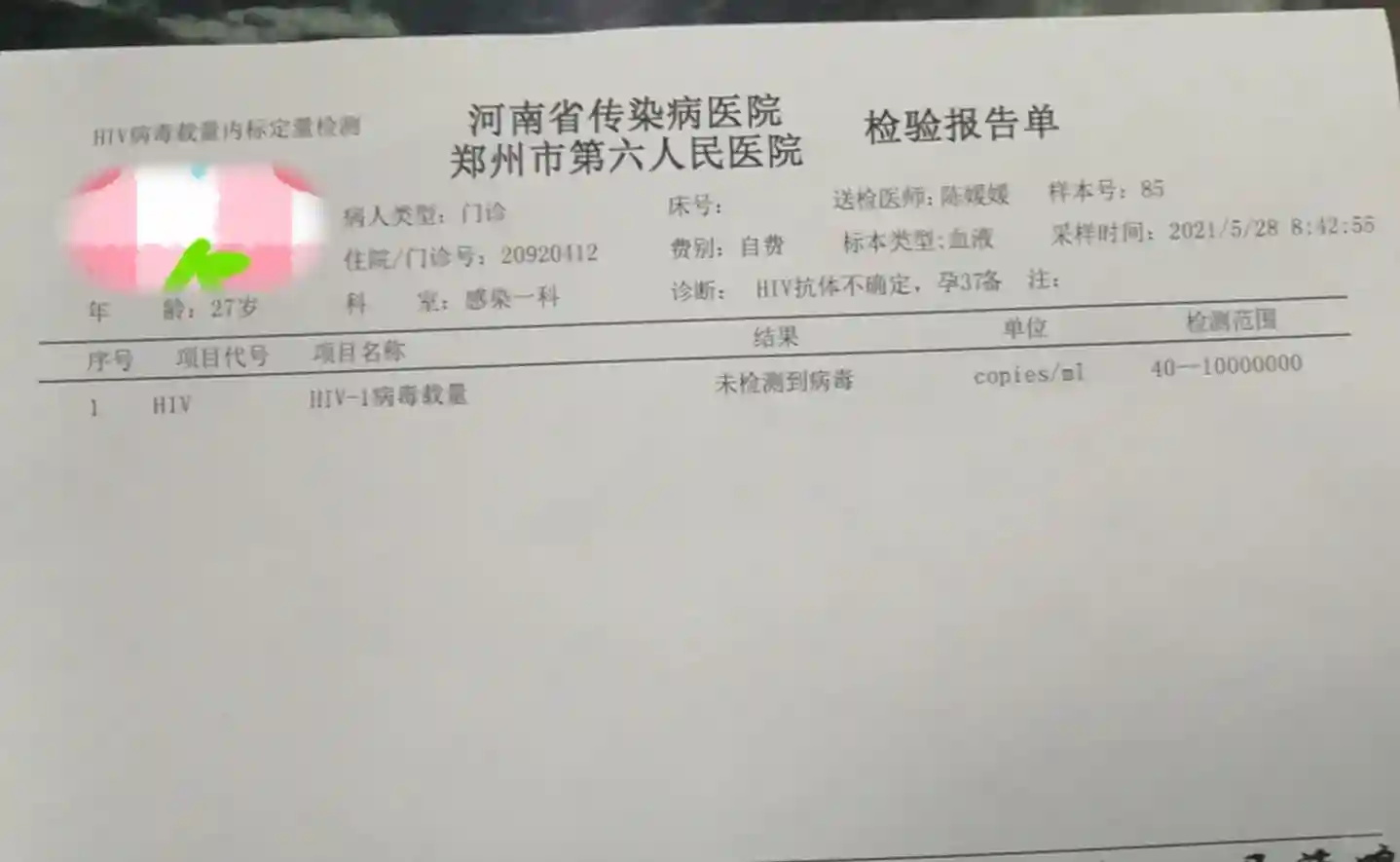 一直想记录一下,总是没有空,图片是我按本地医院公共卫生科的要求,在孕37周时跑到郑州六院去做了病毒载量的检查拿到的阴性结果。一切的一切都是因为在最后一次抽血检查时查了一次传染病四项,以为就是走个过场,谁知道hiv那项显示弱阳性,当天医院就通知我重新抽血,第二次依然弱阳,必须再抽血送到市疾控中心复检。我当时还挺生气,觉得明明是医院弄错了为什么让我一趟一趟跑。市疾控出结果需要等一个星期,当地妇幼保健院专管艾滋病母婴阻断的人劝说我用上阻断药,我心里骂老娘没病吃nm的药啊!我清清白白的一个人,私生活再简单不过了,我明确回复拒绝用药。直到市疾控的复检结果出来仍然是抗体不确定,我彻底崩溃了,直接在产科门诊开始大哭。医生说,现在就是两种情况,一种是孕激素影响,一种是已经感染了但是在窗口期。让我去郑州六院也就是省传染病医院做病毒载量检查,我和家人连夜就坐高铁去郑州。郑州六院可以直接检测血液里的病毒,就能判断到底是阴还是阳。六院的医生说他们见得多了,很多孕妇都有这种情况,不止我一个,尤其是孕晚期激素水平最高的时候。抽了血又等了一个星期,终于拿到了阴性结果。