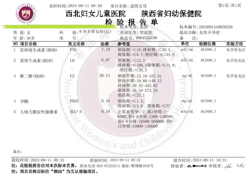 9月11日经期第2天再次返院,做完B超后,医生说可以进周,开了进周五项的单子,使用拮抗剂促排方案。前四天都是果那芬225ml+尿促