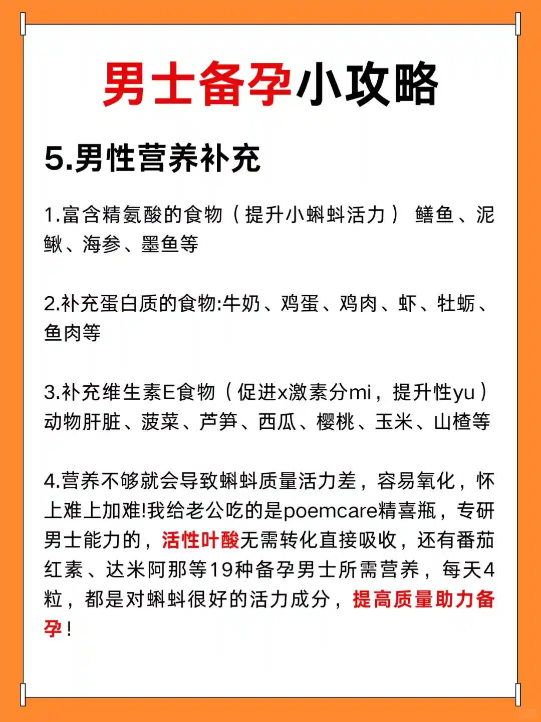 营养不够就会导致质量活力差,容易氧化,怀上难上加难!所以,备孕期种子营养一定要跟上!我给老公吃的是poemcare精喜瓶,专研男士备孕营养的,活性叶酸无需转化直接吸收,还有番茄红素、达米阿那等19种备孕男士所需营养,每天4粒,都是很好的活力成分,提高质量助力备孕!