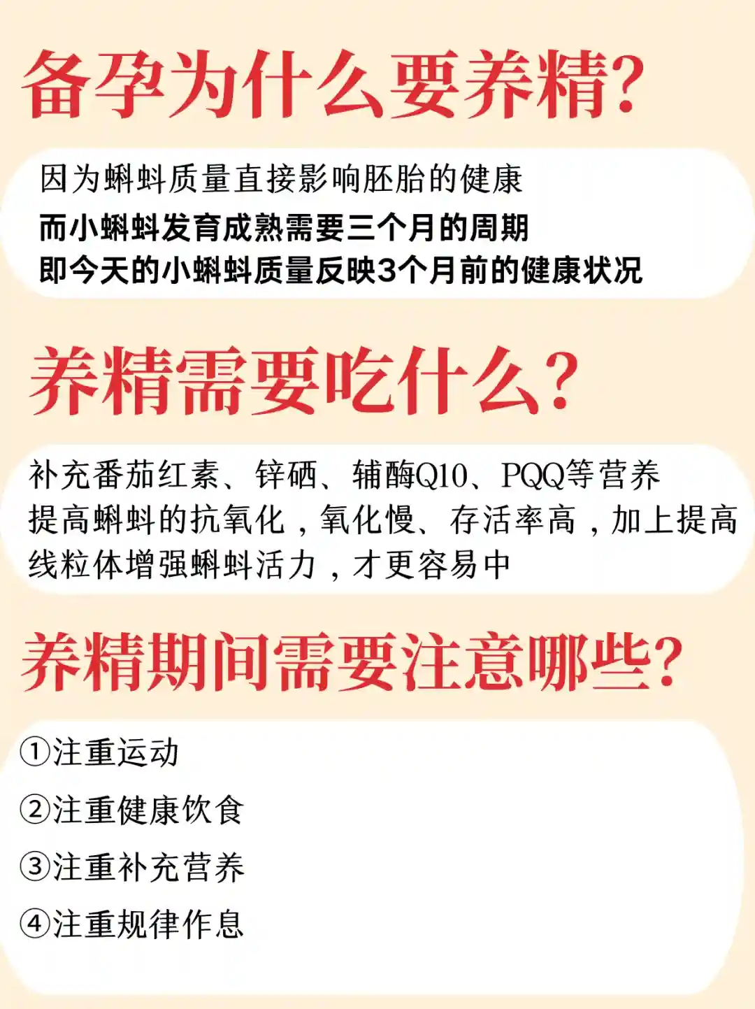 大概就是这样了,我根据自己的经验总结了一些关于弱精养小蝌蚪备孕的知识,都放在图中了,希望姐妹们都能迎来好孕~