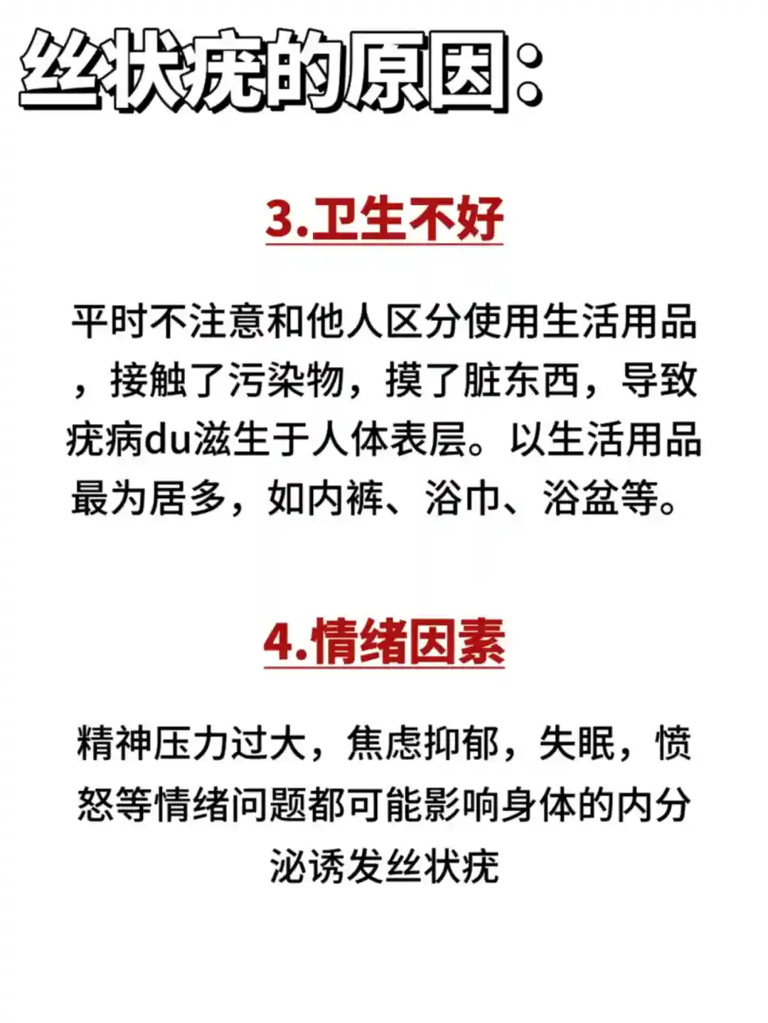 精神压力过大,焦虑抑郁,失眠,愤怒等情绪问题都可能影响身体的内分泌诱发丝状疣