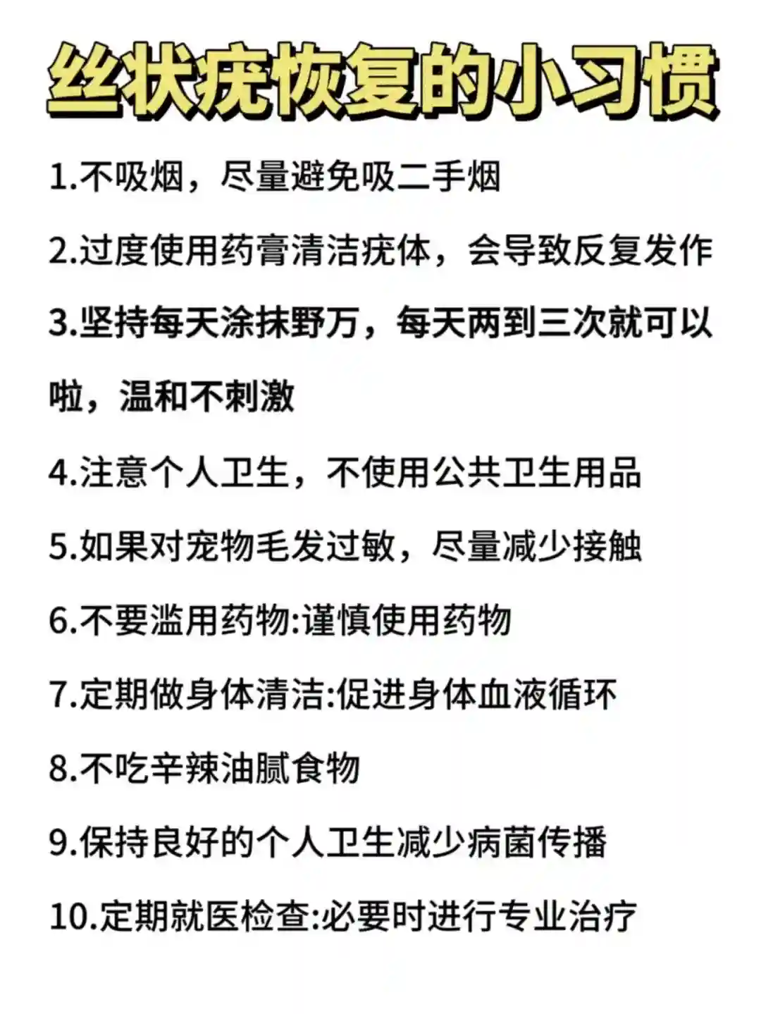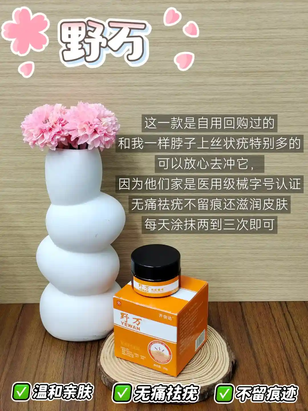 3.坚持每天涂抹野万,每天两到三次就可以啦,温和不刺激4.注意个人卫生,不使用公共卫生用品