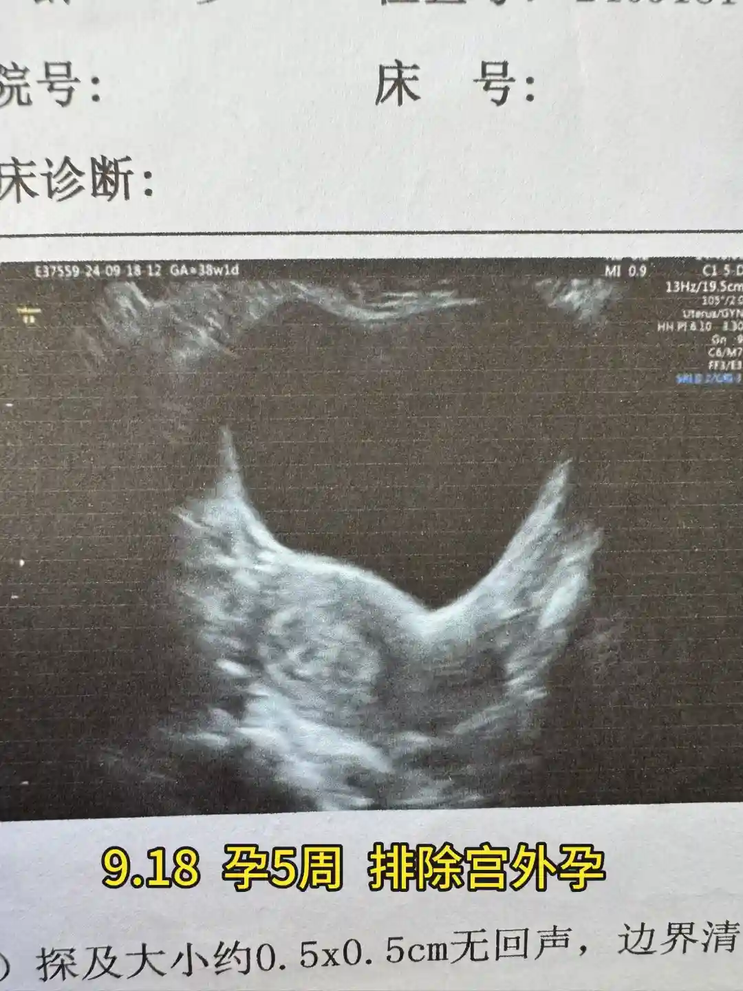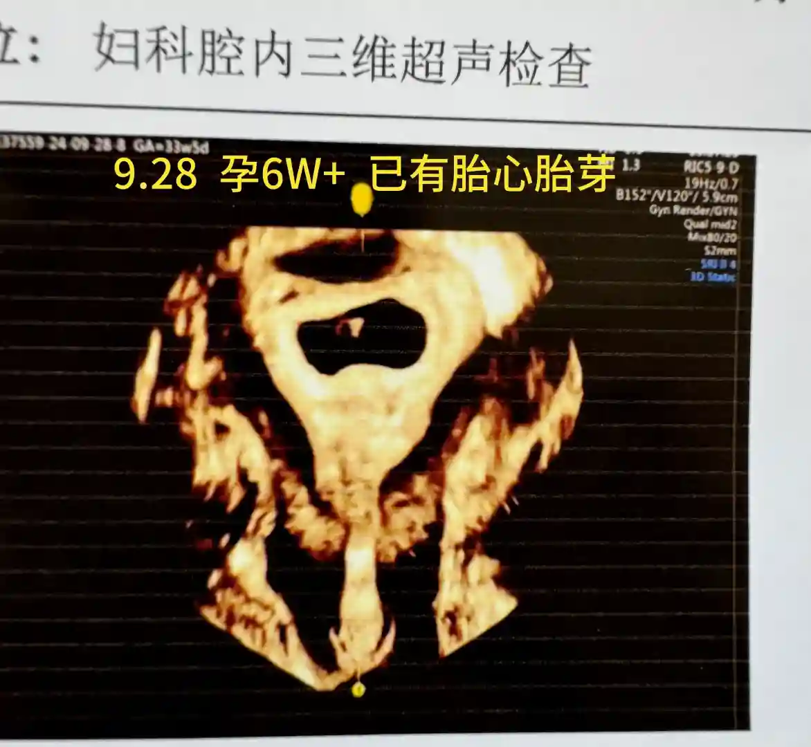 P2:2024.9.28,孕6W+,孕囊2.2×3.1×1.0cm,长出了胎心胎芽,第一次听见胎心,很神奇