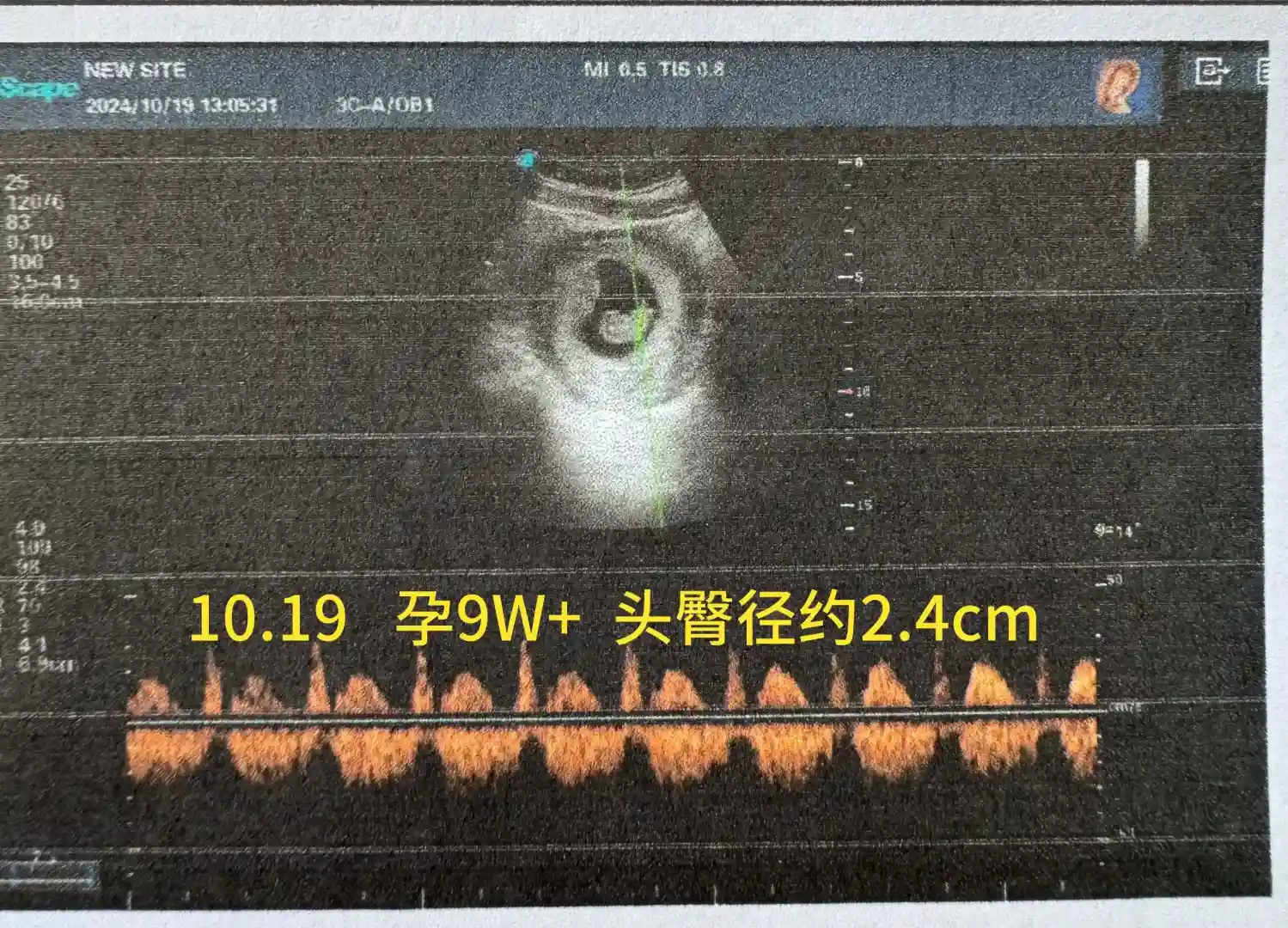 P4:2024.10.19,孕9W+,形成胎儿雏形,头臀径约2.4cm。