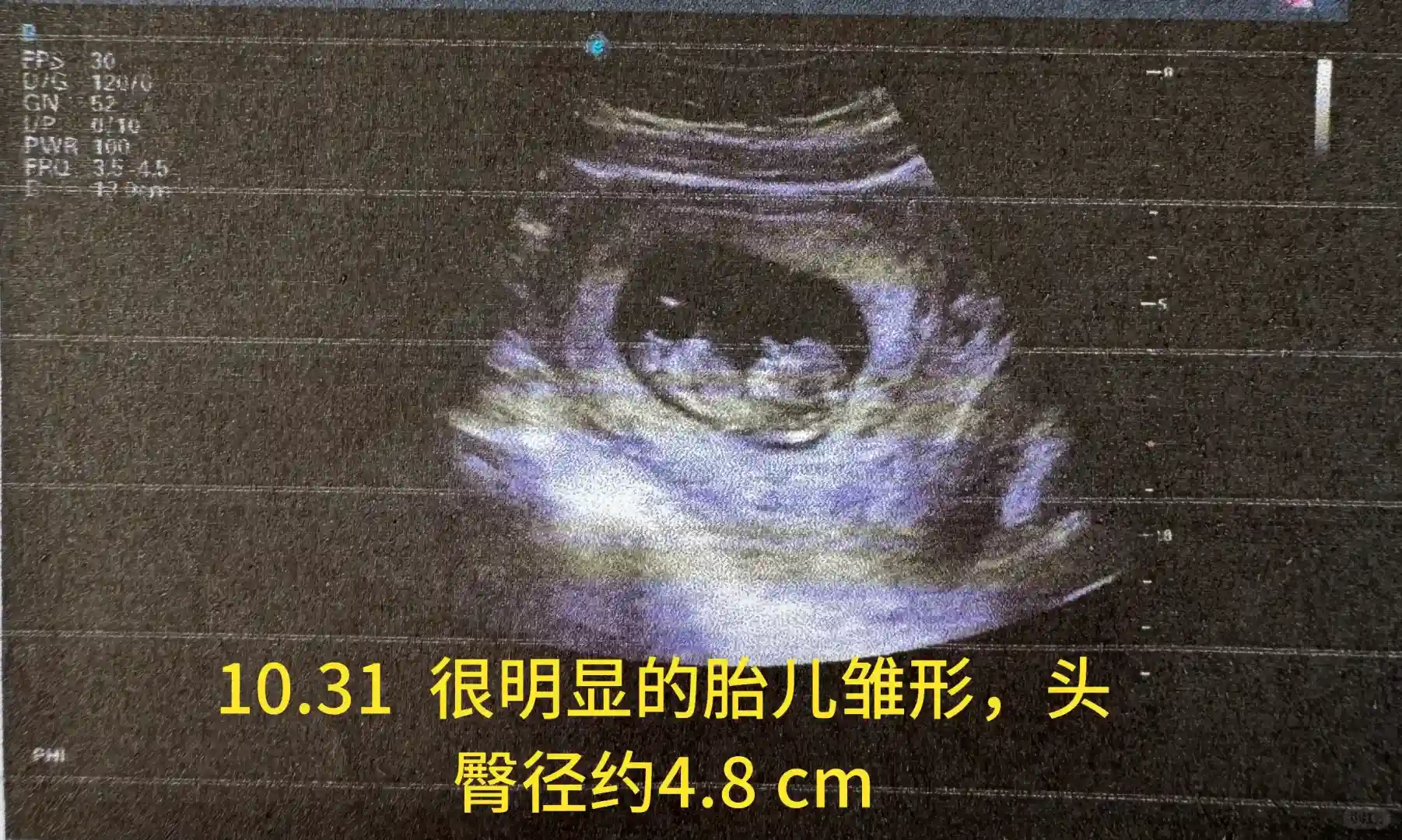 P6:2024.10.31,孕11W+4D,宫腔积液来复查,宫腔积液消失,头臀径约4.8cm。