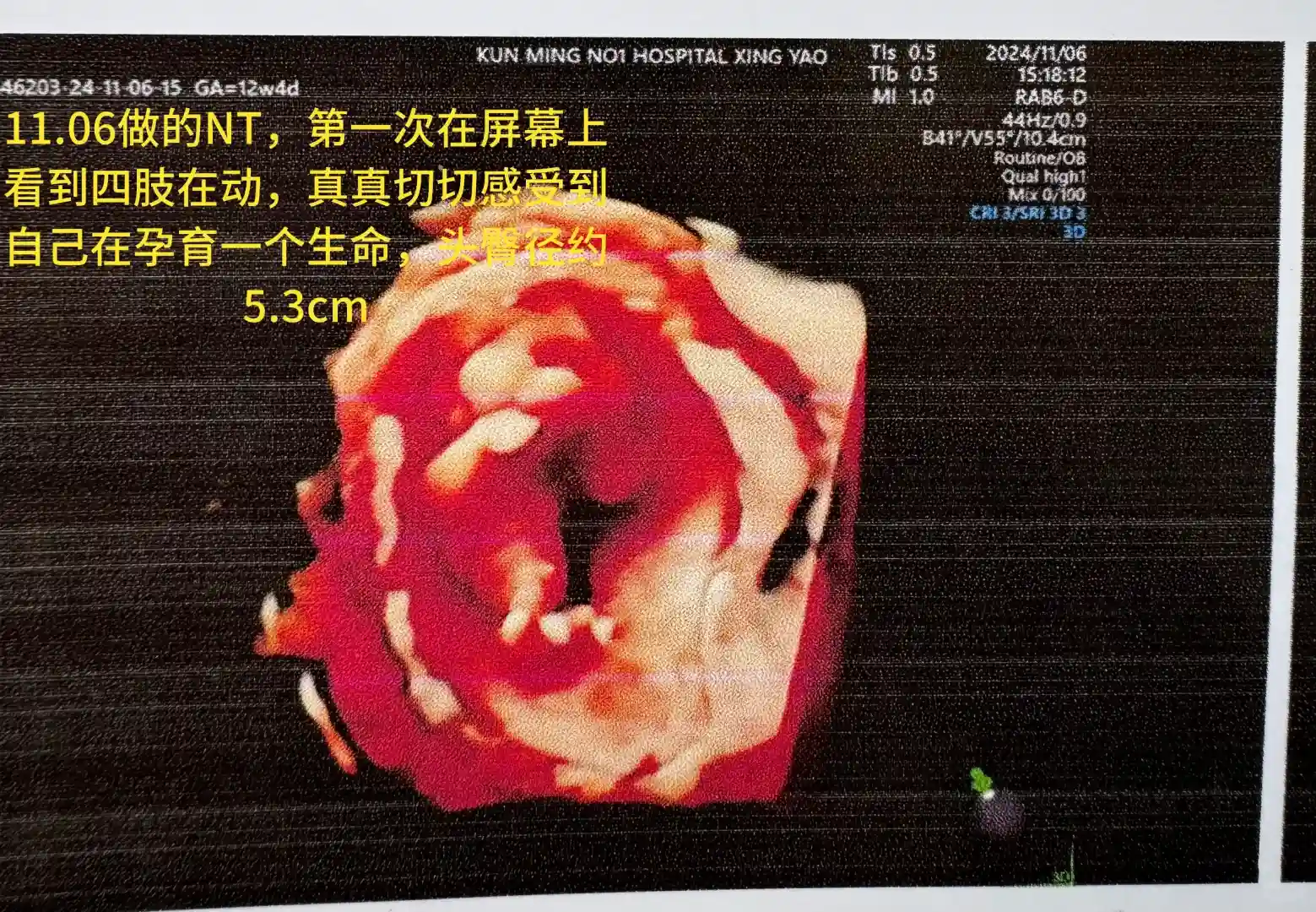 P7:2024.11.06,NT检查,头臀径5.3cm,末次月经8.10,月经龄12W+4D,但B超结果12W+0D,偏小4天,医生说可能是排卵期有点晚(8.29排卵),还有左侧子宫动脉血压高也会引起胎儿偏小,开了阿司匹林控制血压。胎盘位置也有点低。