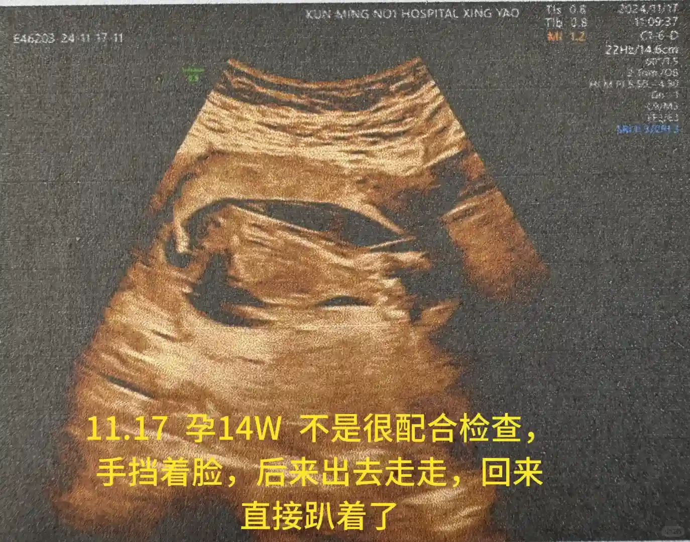 P8:2024.11.17,子宫动脉血压正常,胎盘也涨了上去,头臀径约8cm,月经龄14W+1D,检查出的大小约14W+0D,结果都是好的美中不足就是宝宝不配合,最开始躺着手挡住了脸,看不到鼻骨,医生让出去走走,回来就直接趴着了看到肚子圆圆的,小腿在那蹬真的好搞笑。