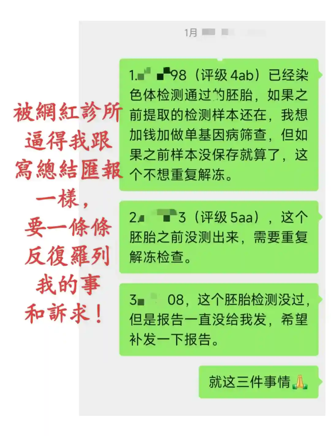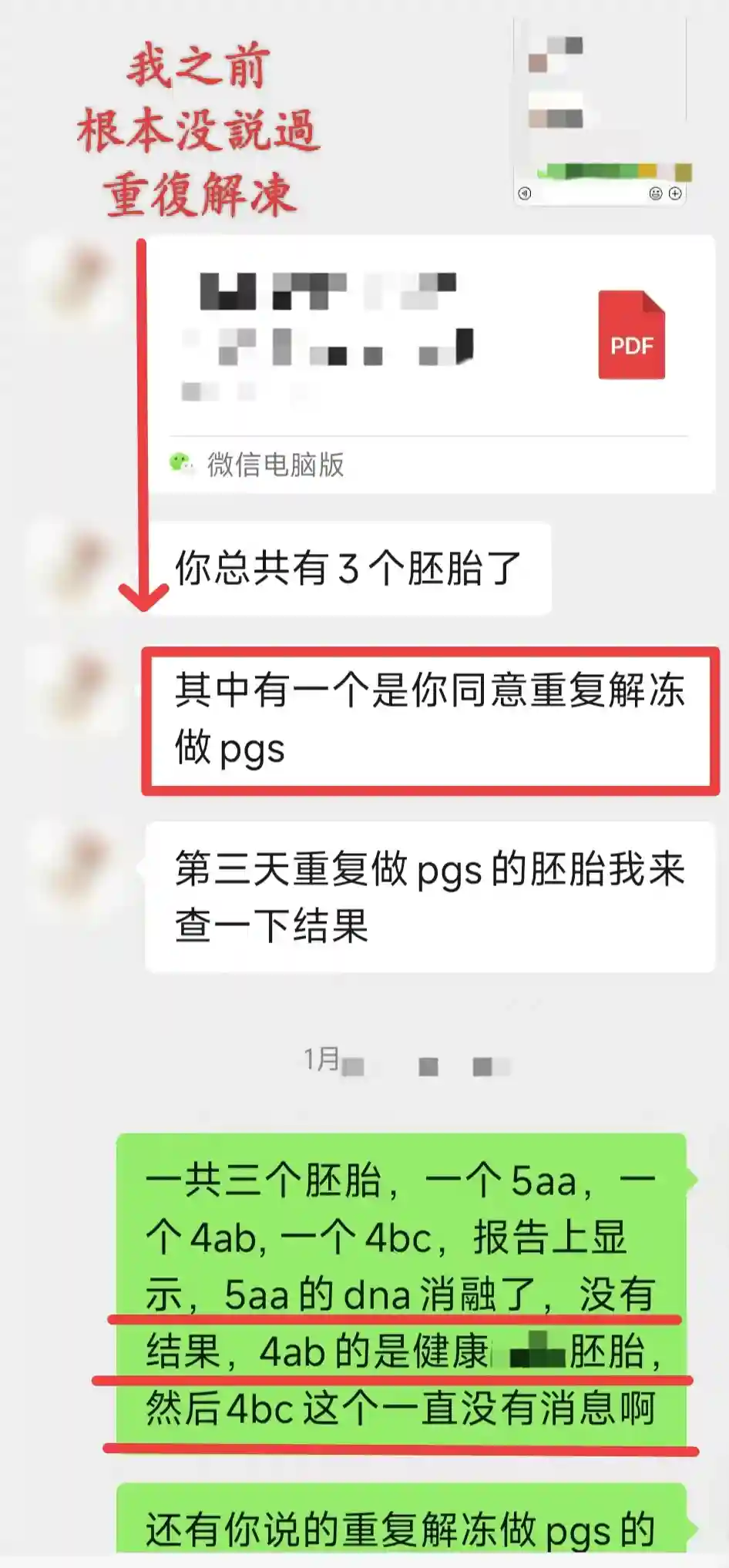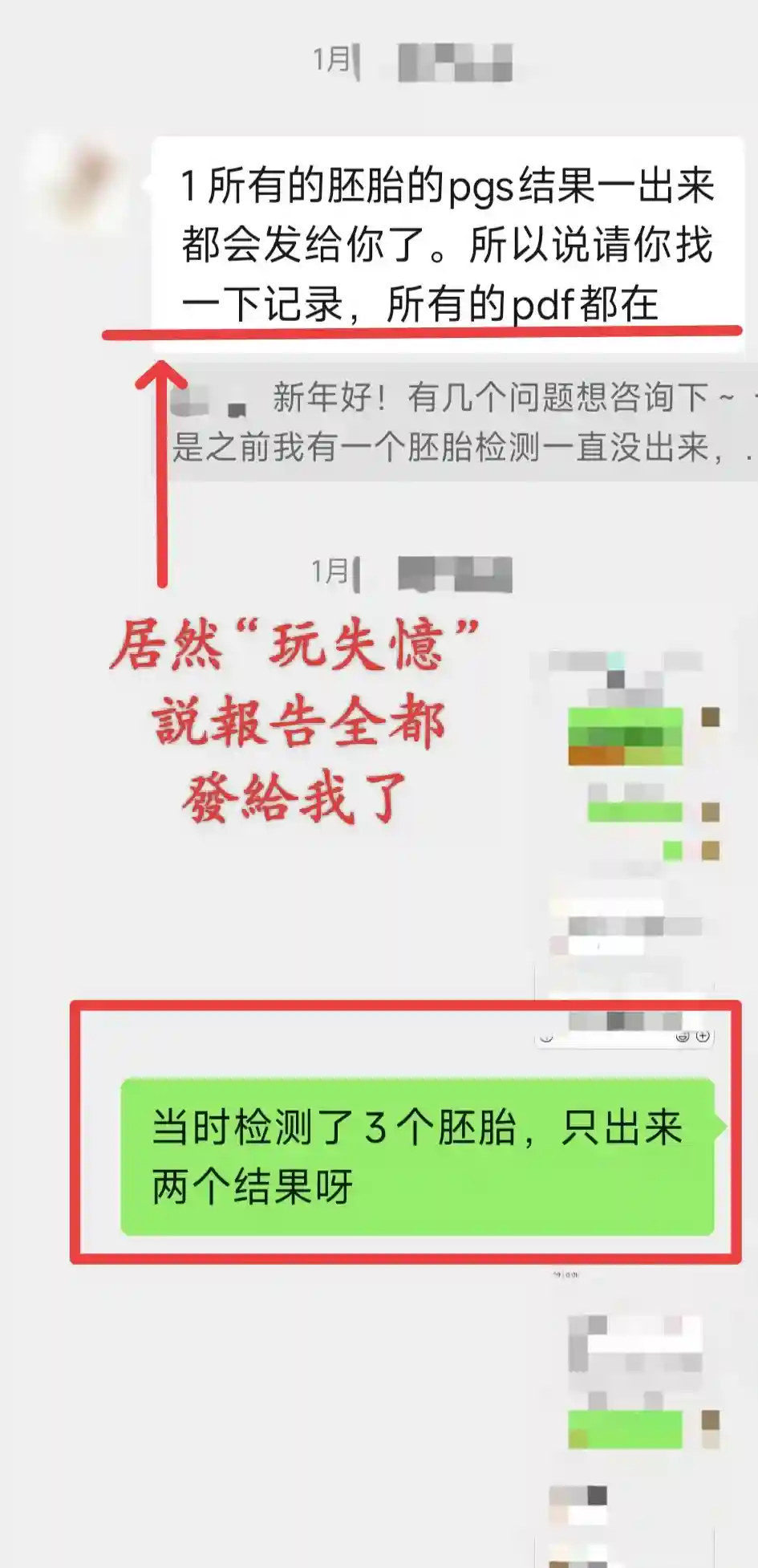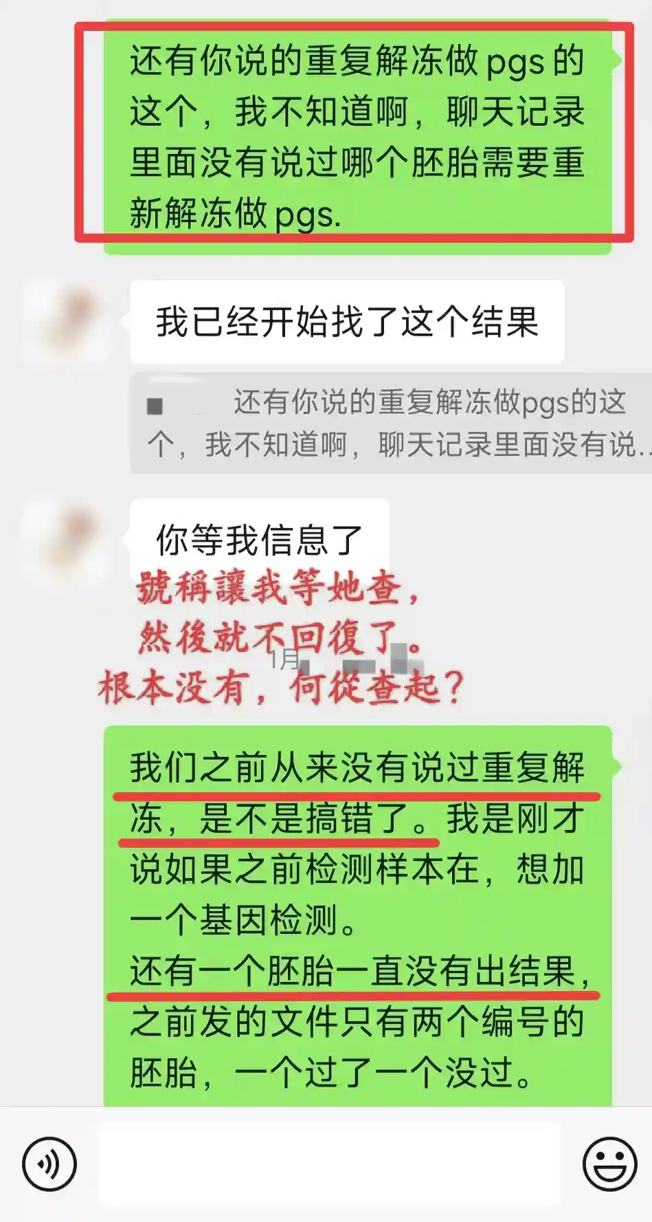 各位想想,换做是你还能忍吗?可“懦弱”如我,又“忍”了——我开始仔细向“主任”解释——三枚囊胚,只有4AB有结果——5AA没检测出来,但我们还没聊过怎么办——4BC漏检,至今下落不明——唯一一件算新加的事,只是我提出如果样本还在,想加个PGT-M。就这么点事,以您“国际部主任”的名头就能糊涂了?还是故意的?