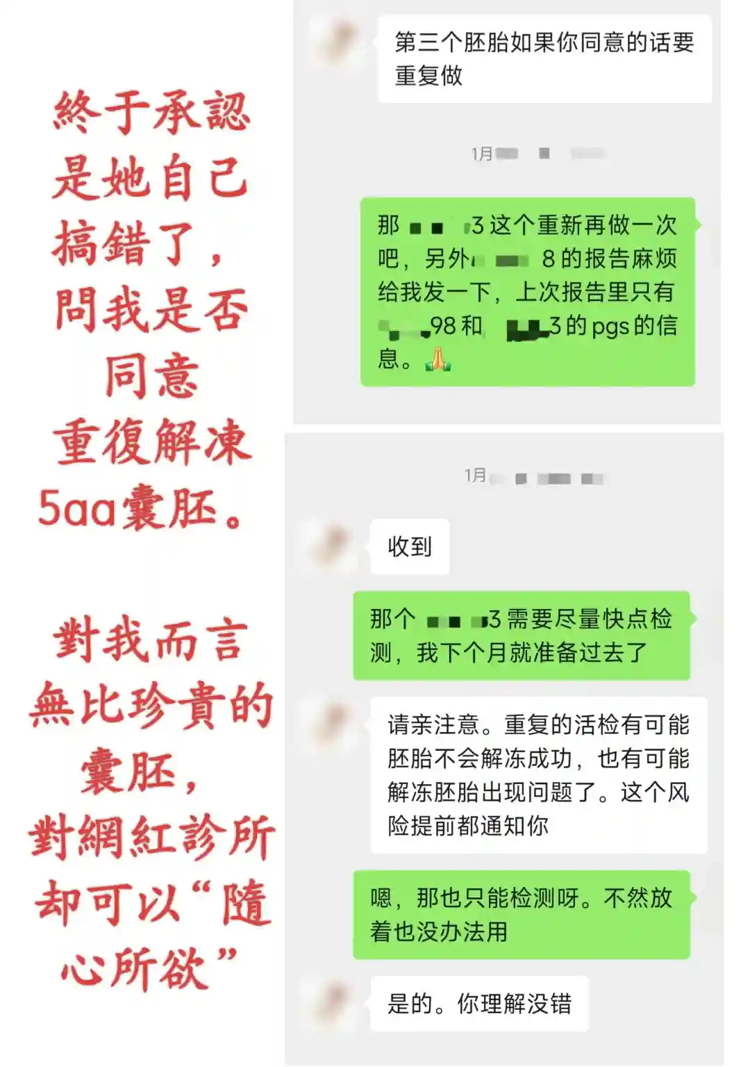 本来我计划2月份移植,但拜网红诊所“先进的技术”+“优质的服务”所赐——直到2月,我才等来5AA的检测结果——神奇的是,这枚曾被网红诊所定义为“DNA降解、完全异常”的囊胚,复检后却变成了正常囊胚!但因为二次解冻,评级降为了4AB。而被“主任”描述为先“漏检”、又“补检”的4BC报告——直到我最终转院,她都没有发给我——可叹几千的检测费,竟是连份报告都要不来!