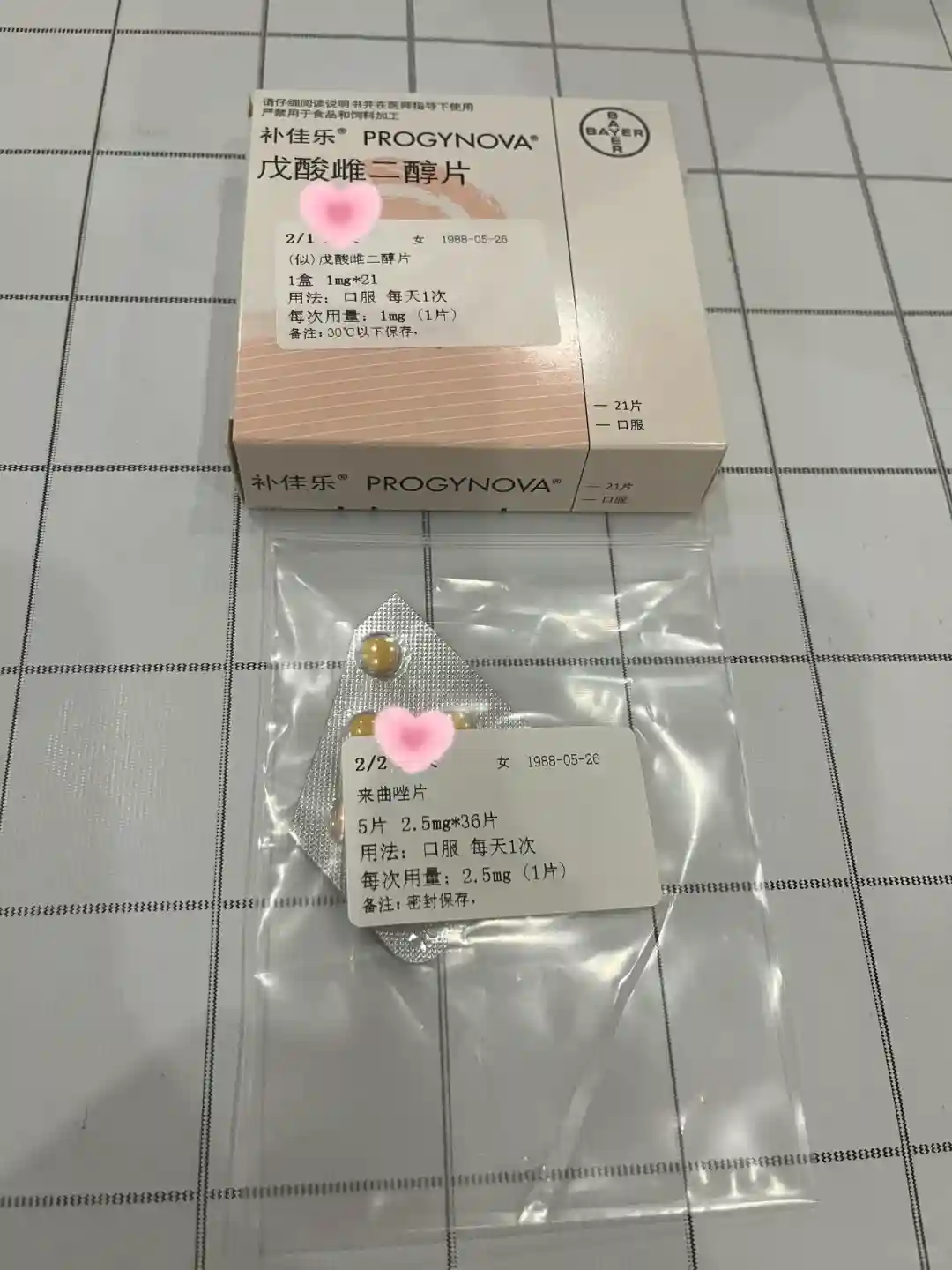 1、来曲唑片,从10月15日开始吃,每天1次,每次1片,吃5天2、戊酸雌二醇片,从10月23日开始吃,每天1次,每次1片,吃2天