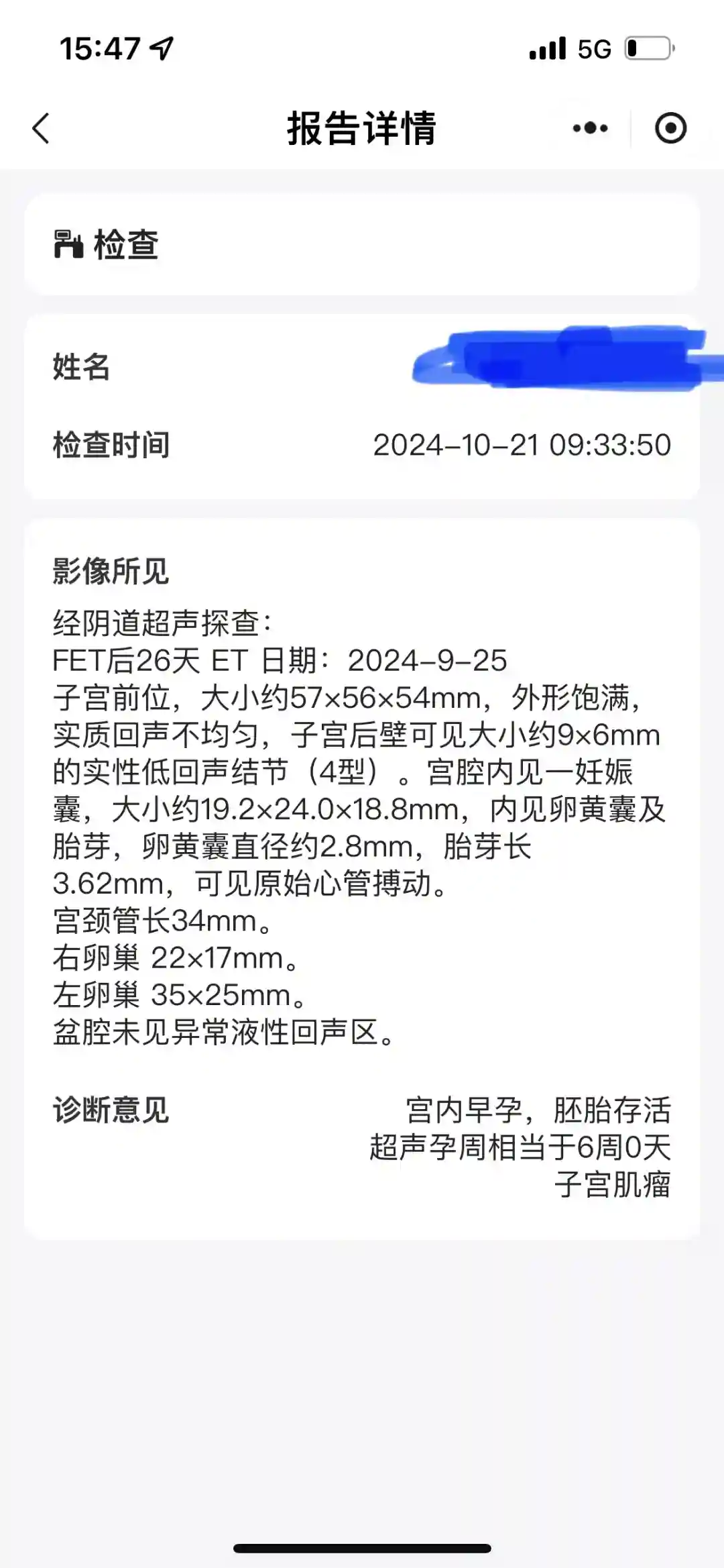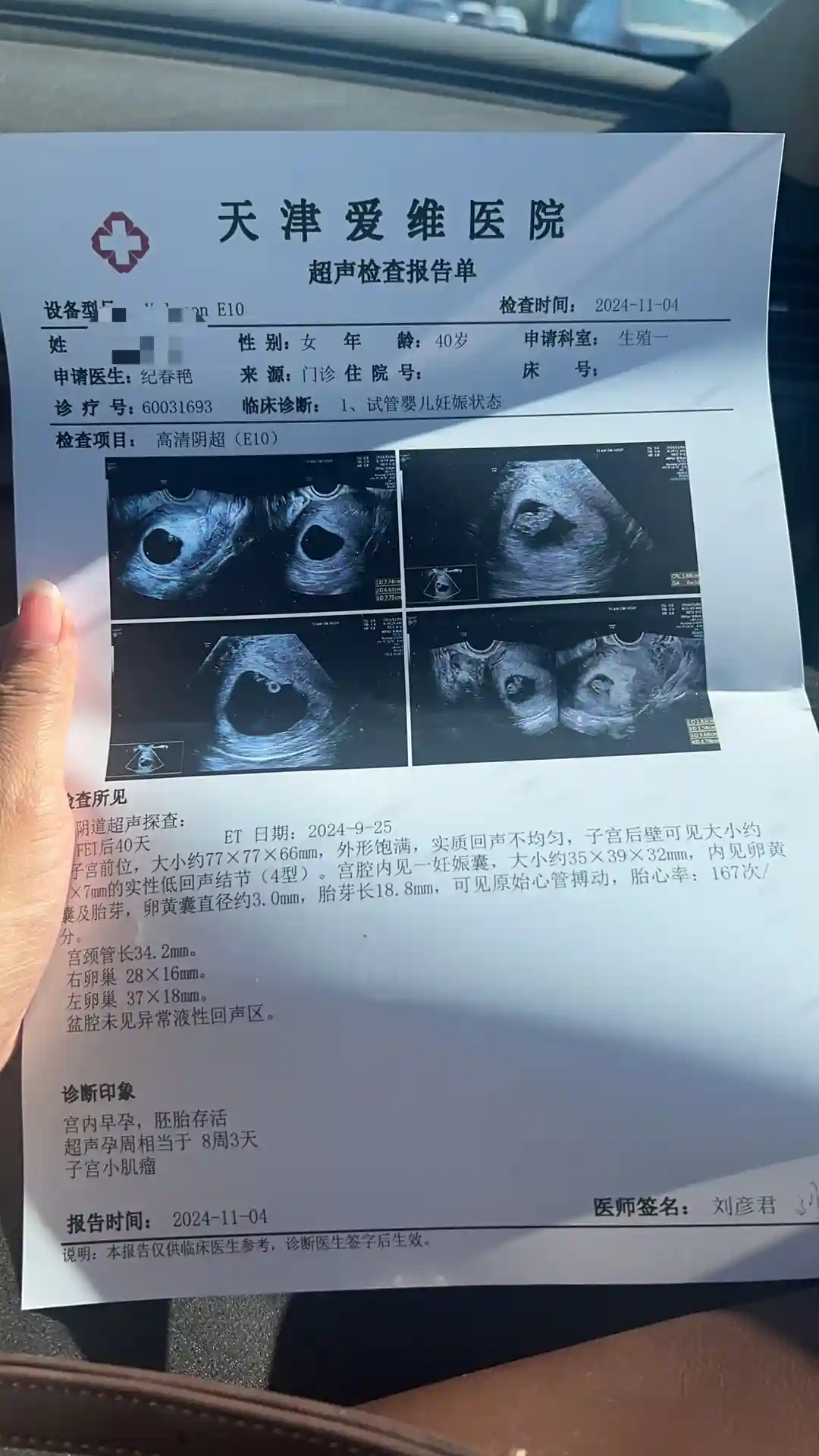 24年9月,经过半年的修养我也做好了所有的心理准备还是决定拼一下。从那天忐忐忑忑的看两道杠加深到担心卡翻倍,直到终于在六周第一次B超时顺利的看到了胎心胎芽。我高兴的拿着报告去找主任,真的喜极而泣。现在我和宝宝顺利的到了9周,我真的很感谢生殖一科室的各位大夫和护士小姐姐,你们见证了我这一路走来的坎坷,你们贴心的呵护让我重新燃起希望,是你们成全了我想要当母亲的梦想