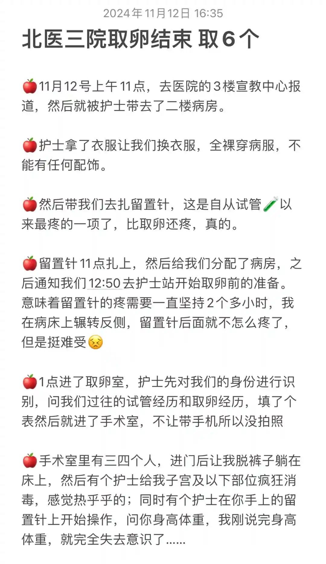 🍎1点进了取卵室,护士先对我们的身份进行识别,问我们过往的试管经历和取卵经历,填了个表然后就进了手术室,不让带手机所以没拍照