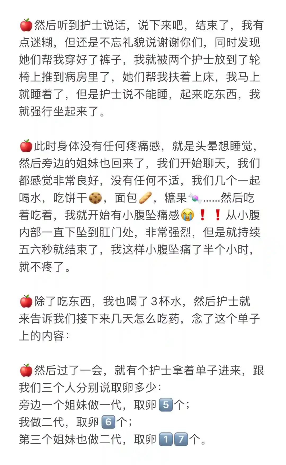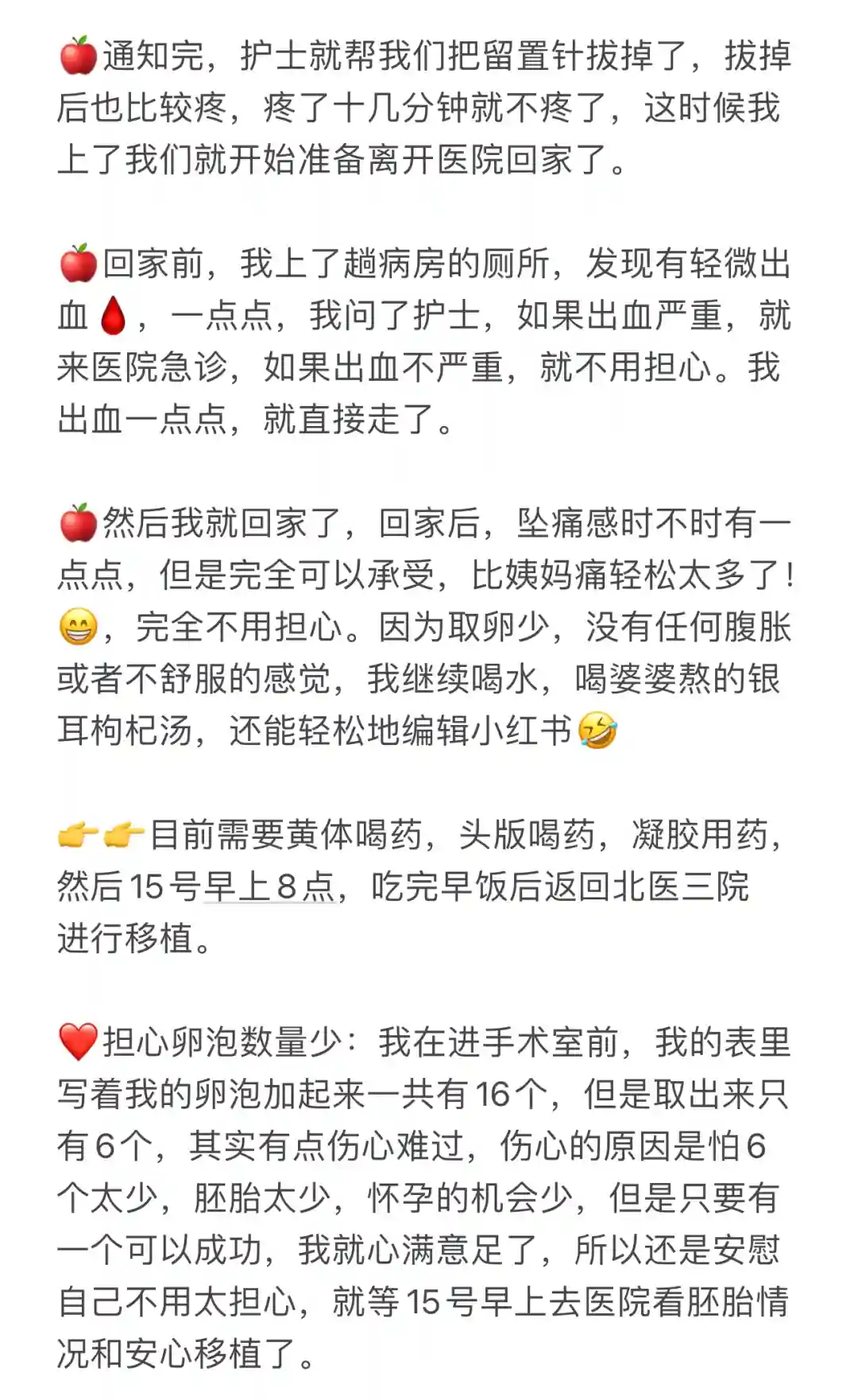 🍎然后我就回家了,坠痛感时不时有一点点,但完全可以承受,比姨妈痛轻松太多了!完全不用担心。因为取卵少,没有任何腹胀或者不舒服的感觉,我继续喝水,喝婆婆熬的银耳枸杞汤,还能轻松地编辑小红书