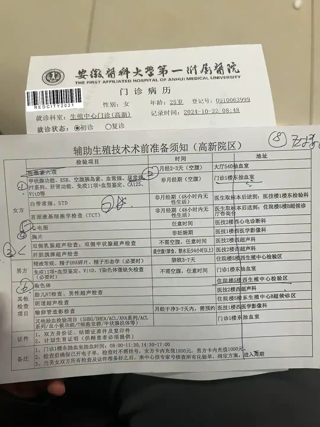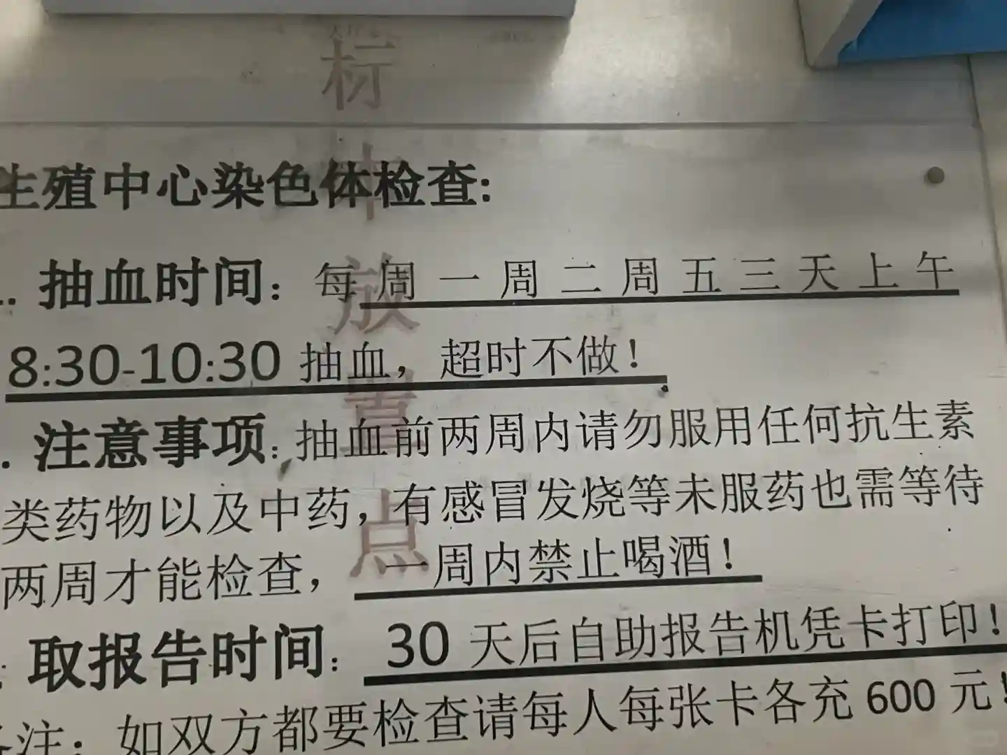 然后就是走流程了抽血验小便白带拍片胸片还有一些甲状腺检查,然后就是染色体我之前有在喝中药调理我不知道查染色体的两周内不能喝中药!!染色体检查得等一个月染色体注意事项在p2。