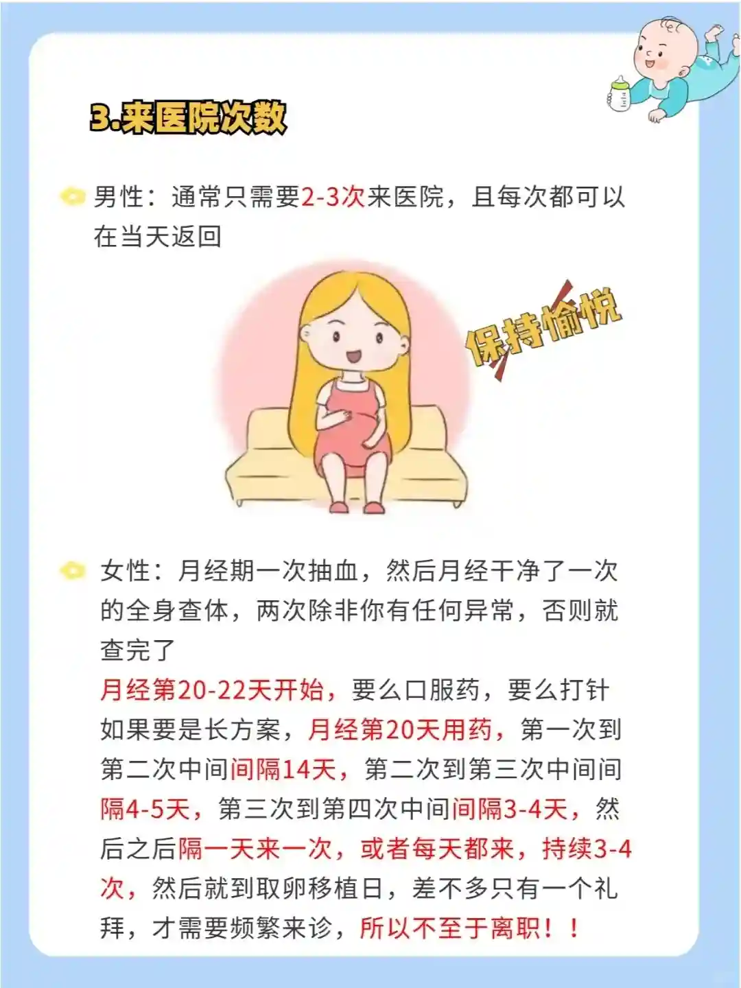 女性:月经期一次抽血,然后月经干净了一次的全身查体,两次除非你有任何异常,否则就查完了。然后月经第20-22天开始,要么口服药,要么打针;如果要是长方案,月经第20天用药,第一次到第二次中间间隔14天,第二次到第三次中间间隔4-5天,第三次到第四次中间间隔3-4天;