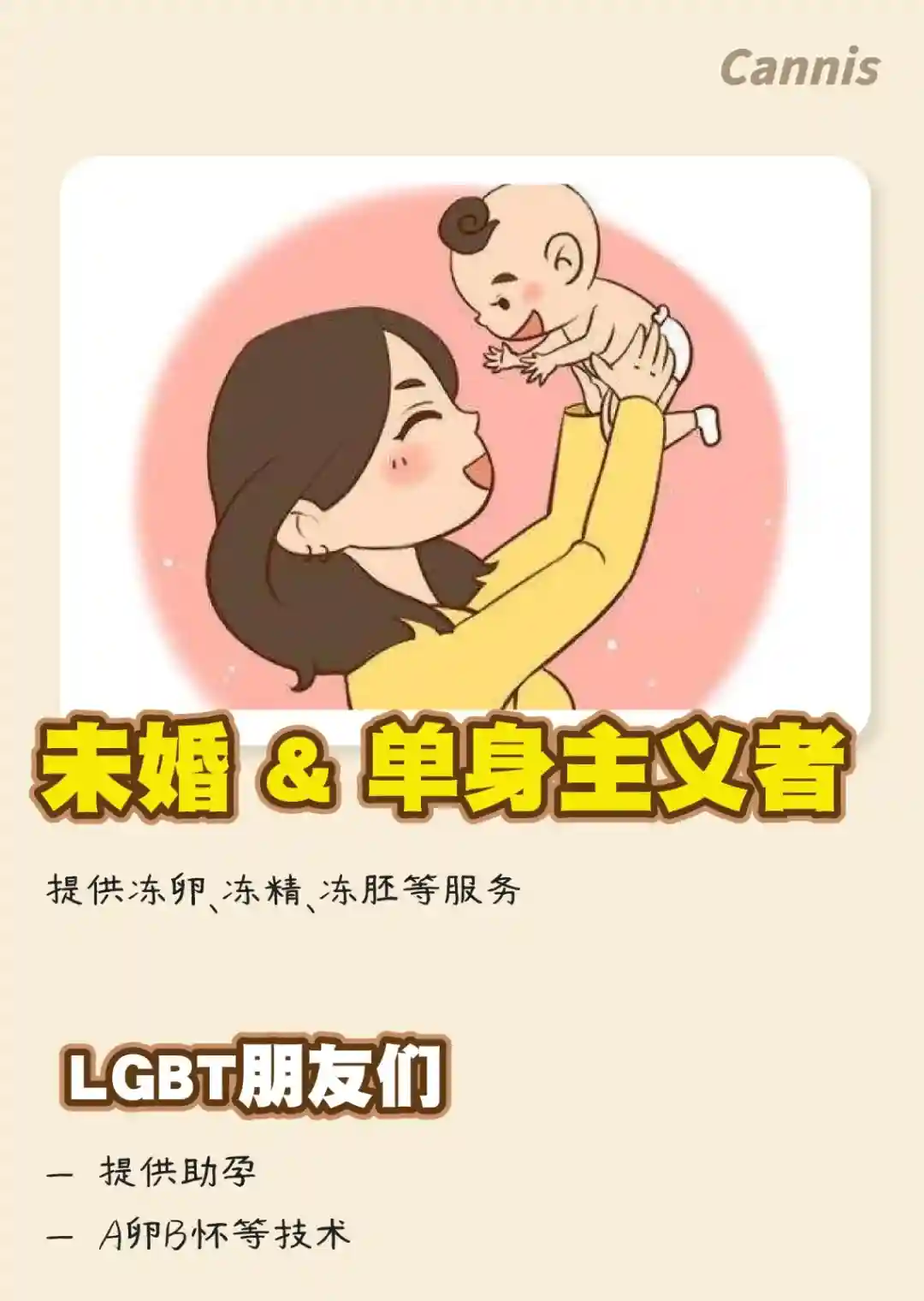 👉 未婚 & 单身主义者 = 提供冻卵、冻精、冻胚等服务;👉 LGBT朋友们 = 提供助孕、A卵B怀等技术;