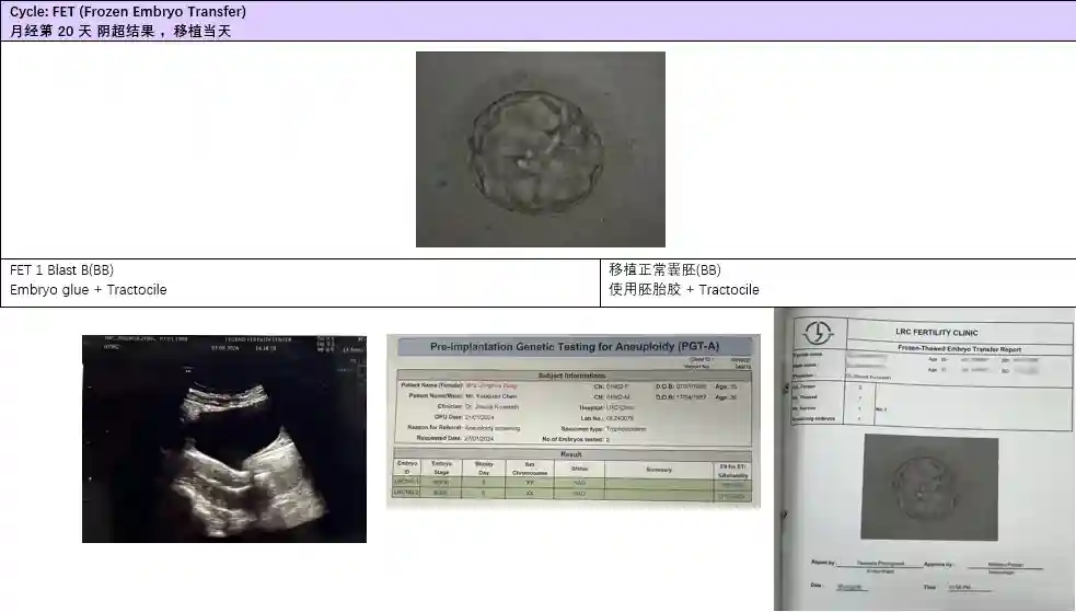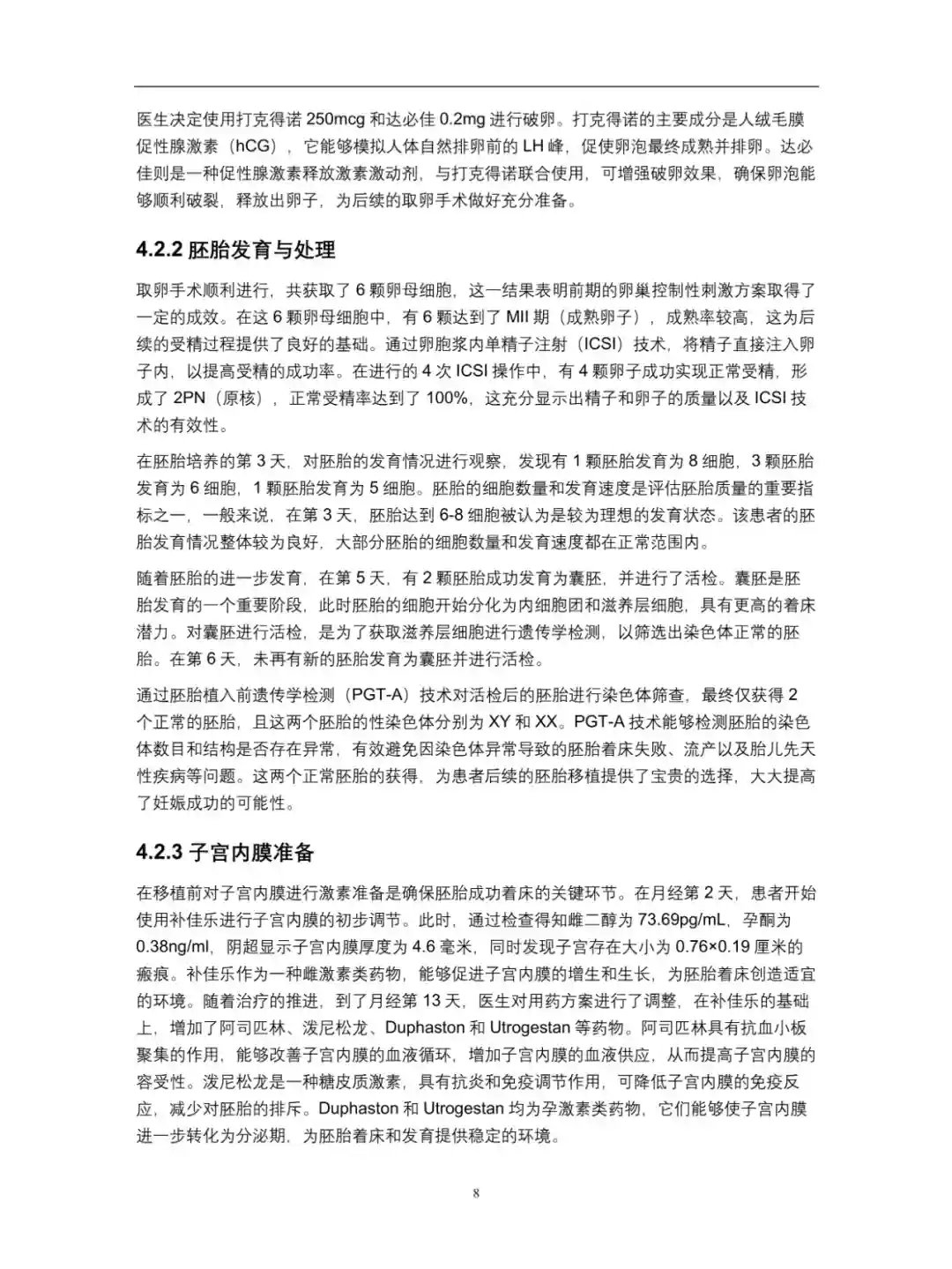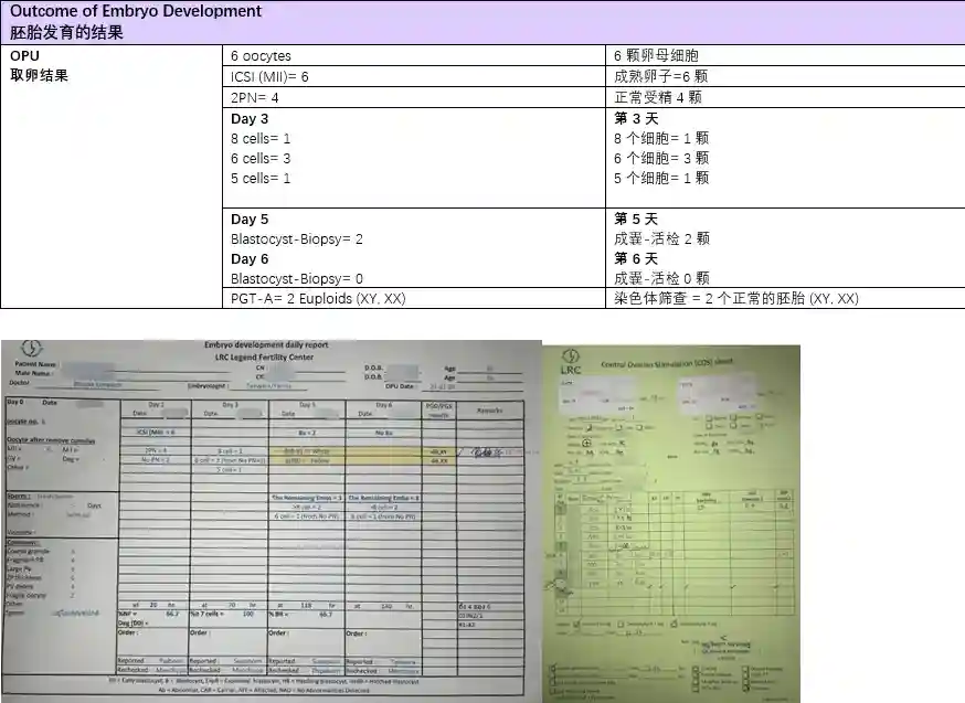 胚胎发育与移植:取卵结果很不错,有 6 个卵泡,6 个 MII 卵子,最后获得 2 个正常胚胎。移植时使用了胚胎胶,帮助胚胎更好地着床。