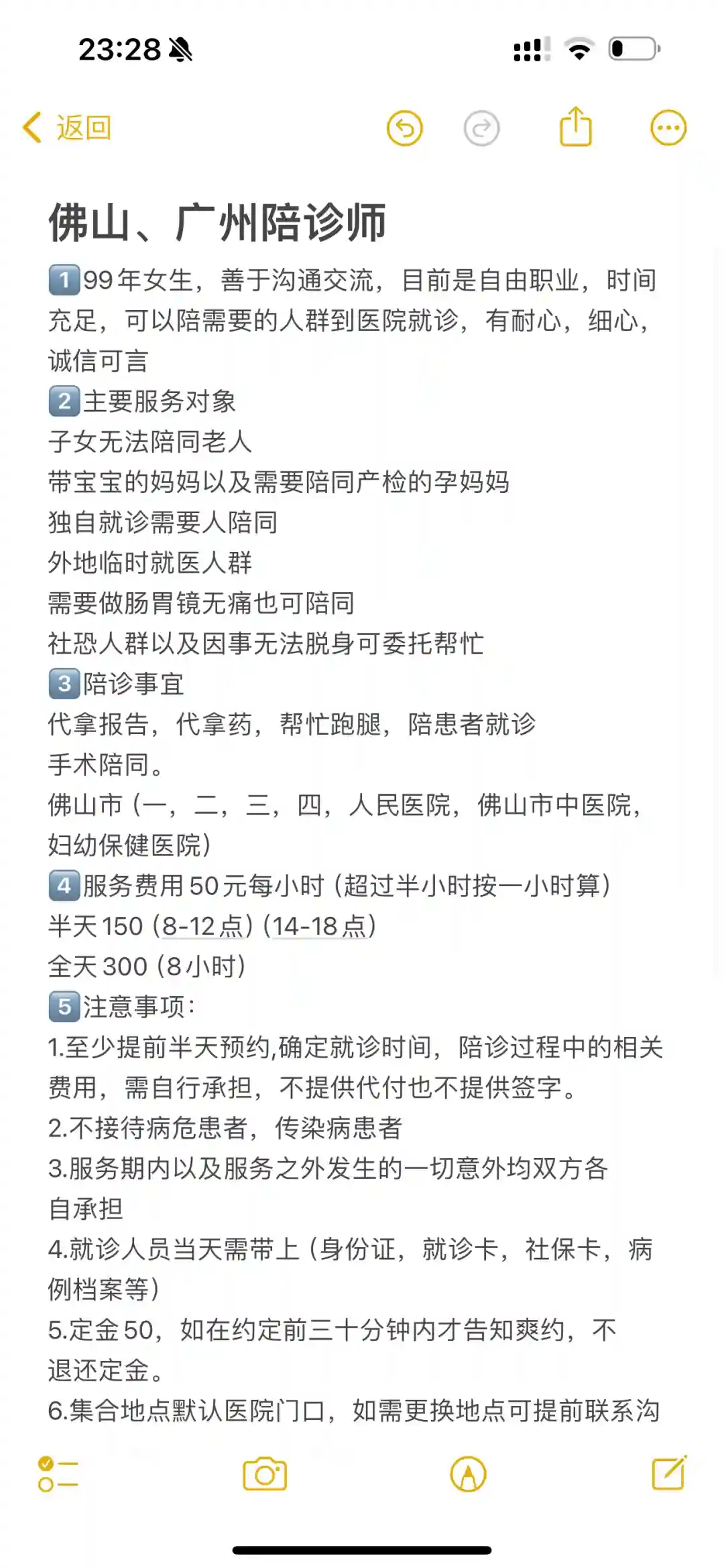 5.定金50,如在约定前三十分钟内才告知爽约,不退还定金。6.集合地点默认医院门口,如需更换地点可提前联系沟通,陪护时间从见面开始算。