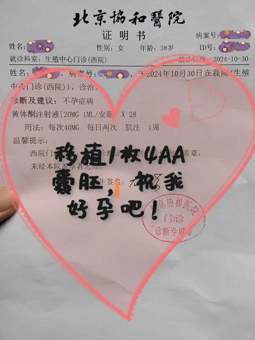 接下来需要每天去社区医院打黄体酮,早晚各一针,希望我的屁屁不要硬结!希望这次能顺利怀孕!我的4AA宝宝,等你啊