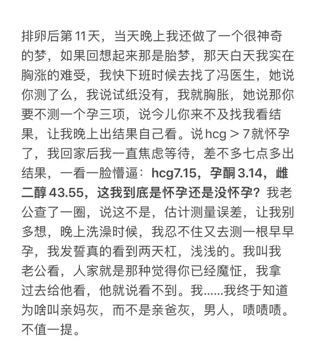 时间跳转到21年国庆,我老公申请成功回深圳职场办公,终于团聚。我们再次启动备孕计划,再去检查,男方依旧还是精子畸形率高,比之前稍微好点97%,但是尝试两三次也没成功,当时我就有点慌了,最后我妈提了一嘴说知道人授么。我就去了解一下,发现这个确实可以提高成功率,而且当时我老公随时可能回香港办公,且我已过30岁,我们觉得再也不能耽误时间,就还是去医院咨询。当时去的是市二院的生殖科,一去先是各种检查,说要身体调整,检查花了一万多,开药五千多,结果吃了一个月药,把我吃的脸色发青发黑,看起来病殃殃,给我的医生爸爸看了一下吃的药,他都无语,说瞎吃什么,让我别吃了。我就又去咨询人授,结果发现医生一早让我做人授的检查,我自己没听到,就耽误了,所以我又前后耽误两个月,当时内心也有点期望觉得在调理时候能怀,当时以为市二院生殖科检查得自费,就跑去市妇幼做一些项目,第一个项目就是做了Amh值和性激素六项。至此我终于什么叫Amh值,也有了这篇分享的来历。也就是这个检查改变了我的命运,我跟我老公自嘲说,我叫没卵女,他叫畸精男。真是患难夫妻,谁也别嫌弃谁。