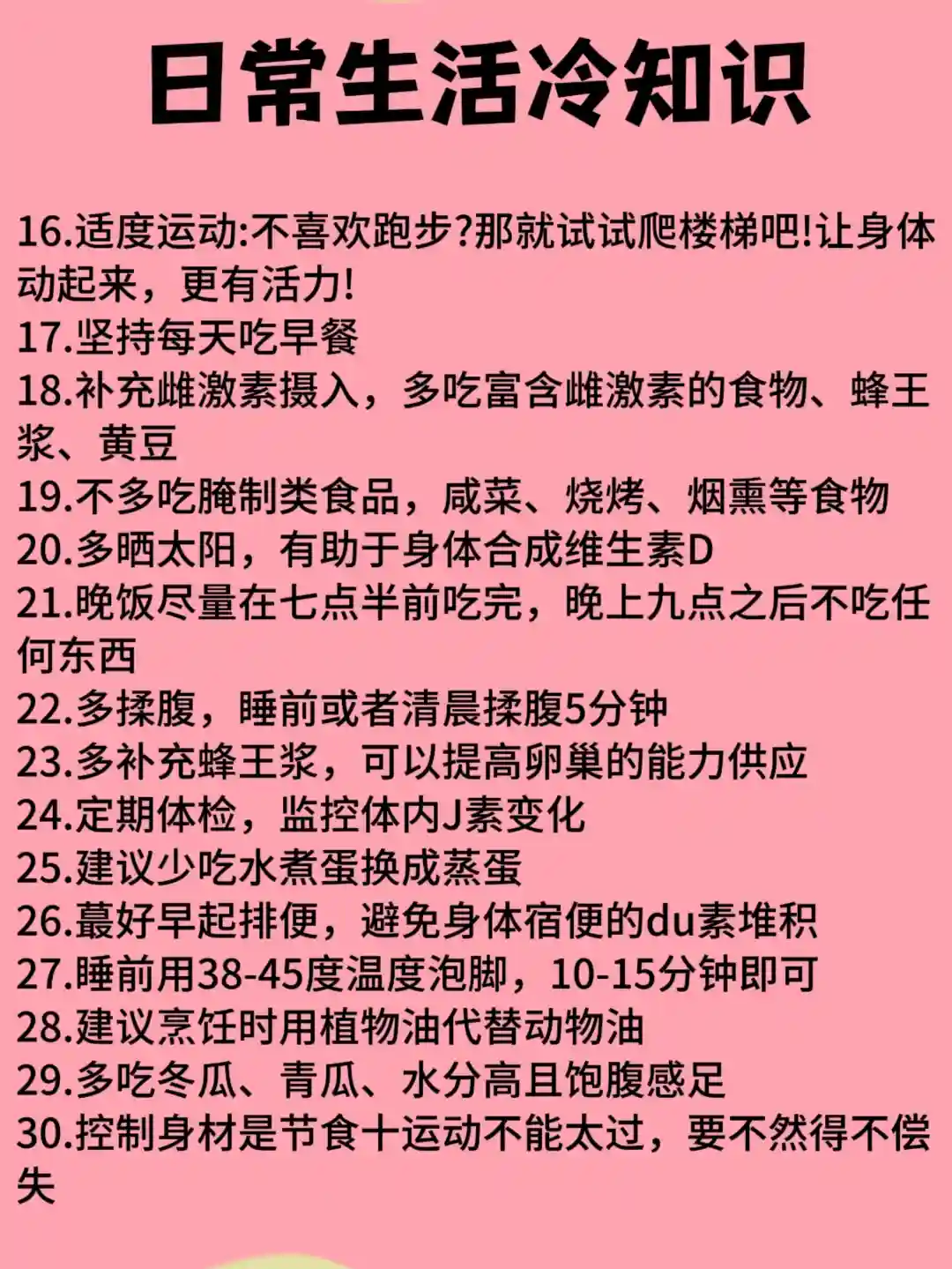 每天坚持运动半小时,多做有氧运动,如跳绳跑步、游泳等,还可以分泌多巴胺调节心情,有利于新陈D谢,实在不行的姐妹每周也要三次以上!
