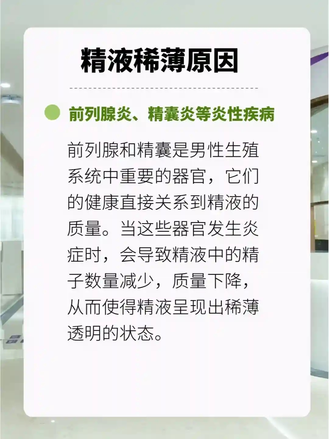 前列腺和精囊是男性生殖系统中重要的器官,它们的健康直接关系到精液的质量。当这些器官发生炎症时,会导致精液中的精子数量减少,质量下降,从而使得精液呈现出稀薄透明的状态。